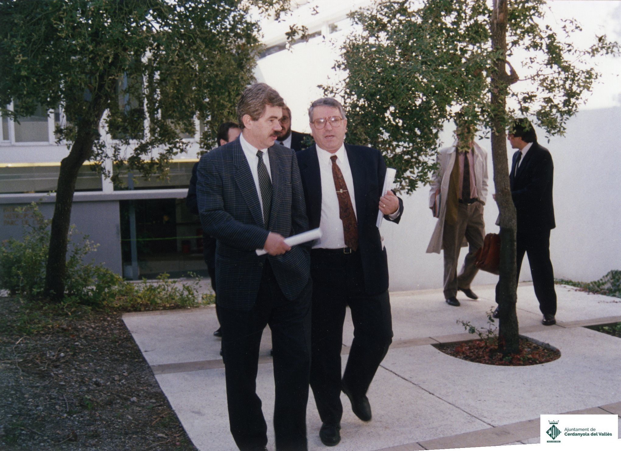 El President de la Generalitat de Catalunya, Pasqual Maragall i Mira, amb l'alcalde de Ajuntament de Cerdanyola del Vallès, Celestino Sánchez González, visiten un emplaçament del Consorci del Parc Natural de la Serra de Collserola el novembre de 1991