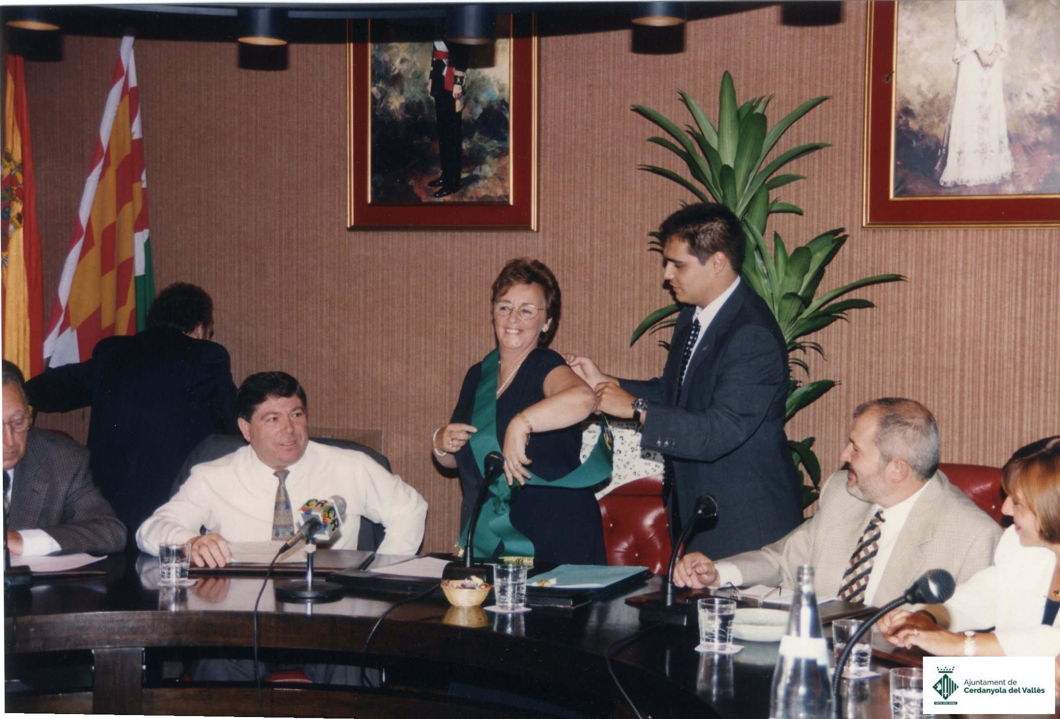 Cristina Real Masdeu pren relleu de Celestino Sánchez González com alcaldesa de Cerdanyola del Vallès durant la sessió d'investidura realitzada a la sala del Ple de l'Ajuntament de Cerdanyola del Vallès el setembre de 1997