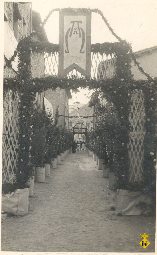 Gent passant per el carrer Travessera de l'església, engalanat per a la vinguda de la Mare de Déu de Fàtima