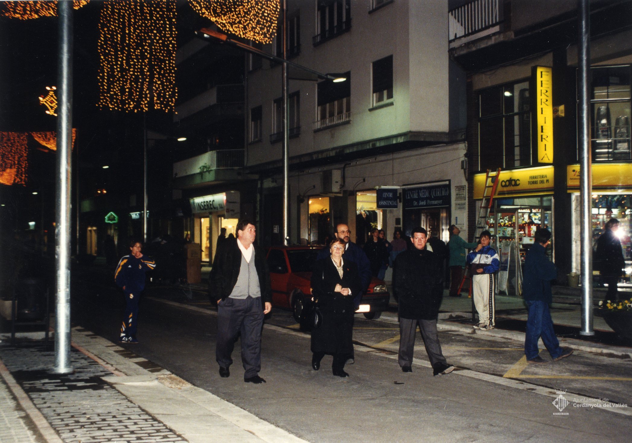 L'alcaldessa de Cerdanyola del Vallès, Cristina Real Masdeu, revisa l'acondicionament de l'Avinguda de Catalunya per les festes de Nadal el desembre de 1998
