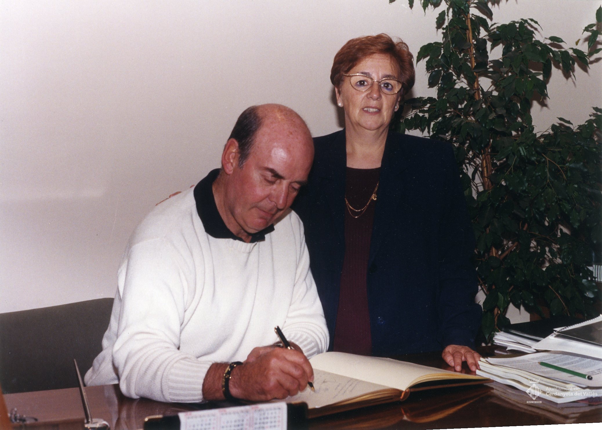 Visita oficial i acte de signatura del Llibre d'Honor de l'Ajuntament de Cerdanyola del Vallès de veterans del Futbol Club Barcelona de la mà de l'alcaldessa Cristina Real Masdeu el juny de 1999
