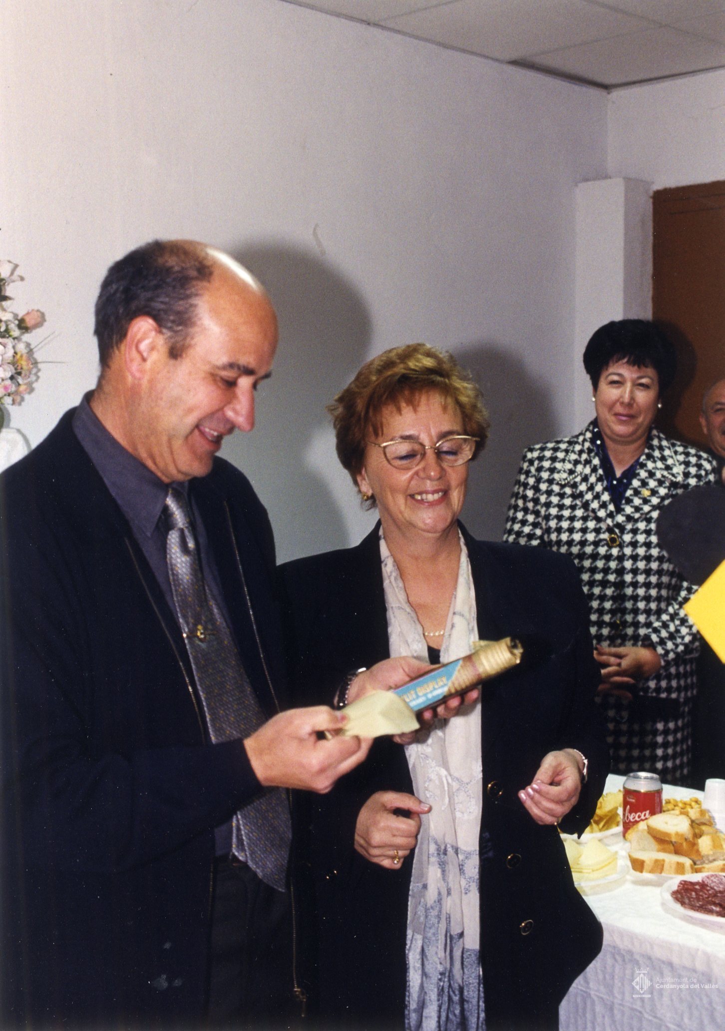 L'Alcalde d'Hinojosa del Duque, Antonio Ruiz Sánchez, visita la seu de la Hermandad Filial de Nuestra Señora de la Antigua de Cerdanyola del Vallès de la mà de l'alcaldessa Cristina Real Masdeu en motius de la celebració de la tradicional romeria l'abril de 2000