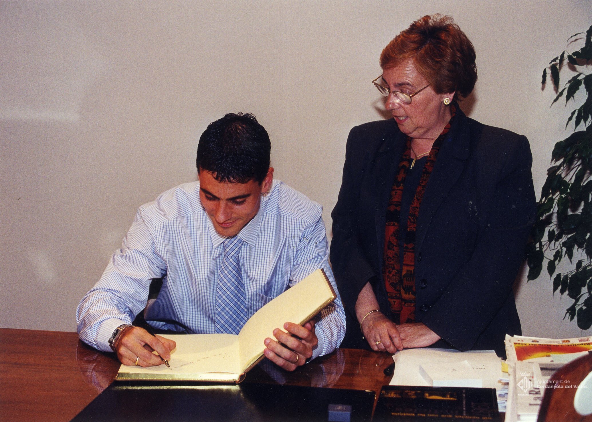 Visita oficial i acte de signatura del Llibre d'Honor de l'Ajuntament de Cerdanyola del Vallès del futbolista del FC Barcelona Daniel García Lara (Dani) el maig de 2000