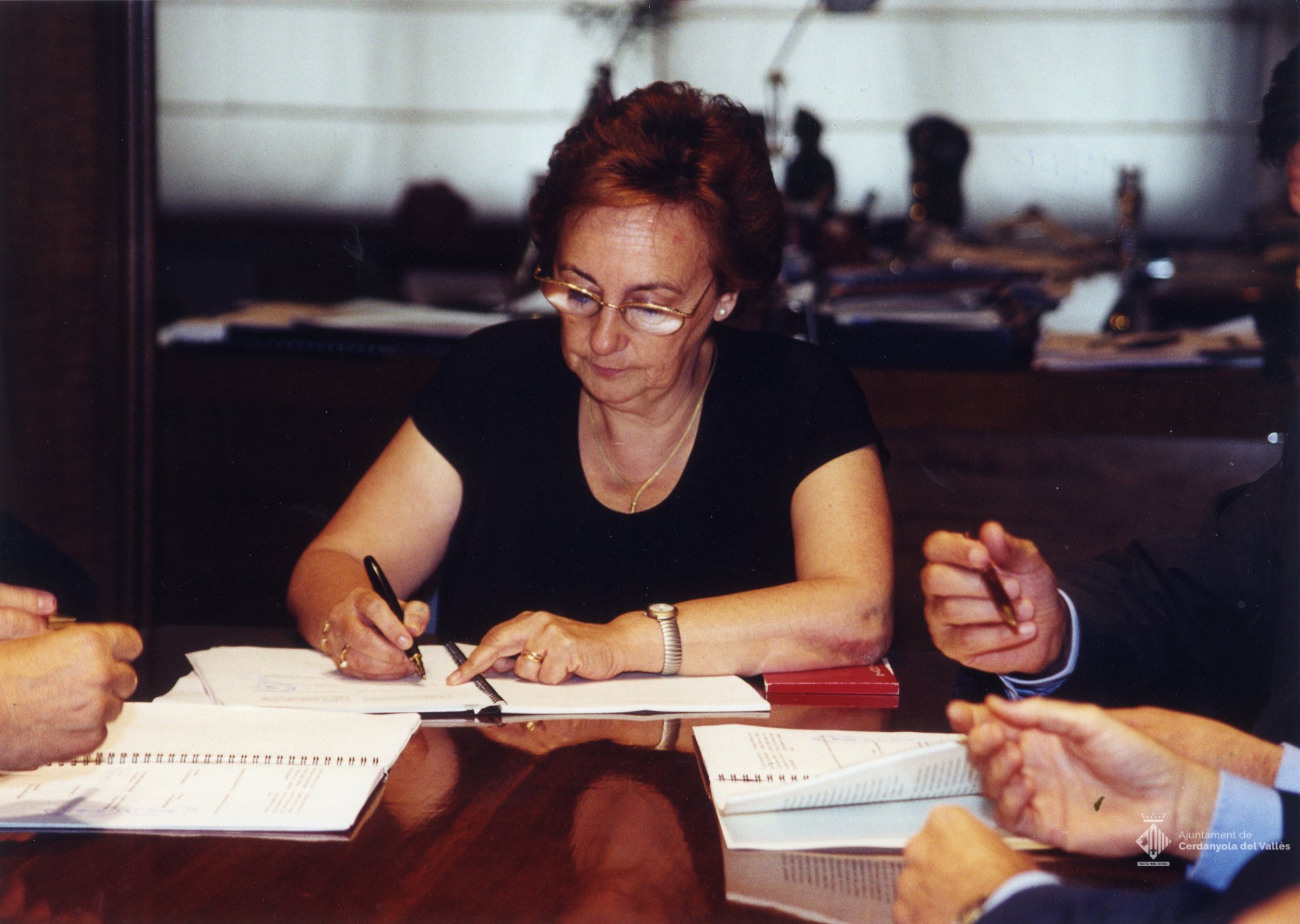 L'alcaldessa Cristina Real Masdeu fa acte de signatura al despatx d'Alcaldia de l'Ajuntament de Cerdanyola del Vallès el juliol de 2000