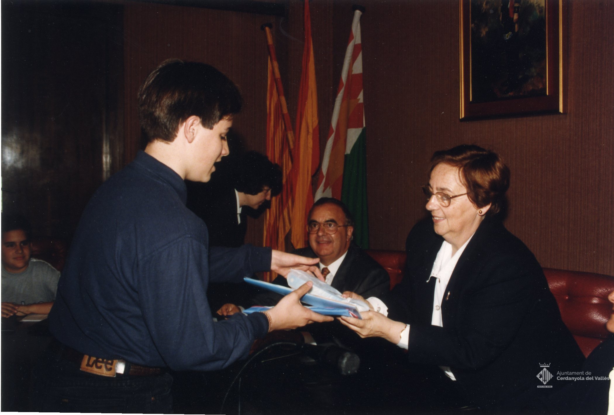 L'alcaldessa Cristina Real Masdeu fa entrega dels premis Àlbum Comerç a la sala del Ple de l'Ajuntament de Cerdanyola del Vallès l'abril de 1998