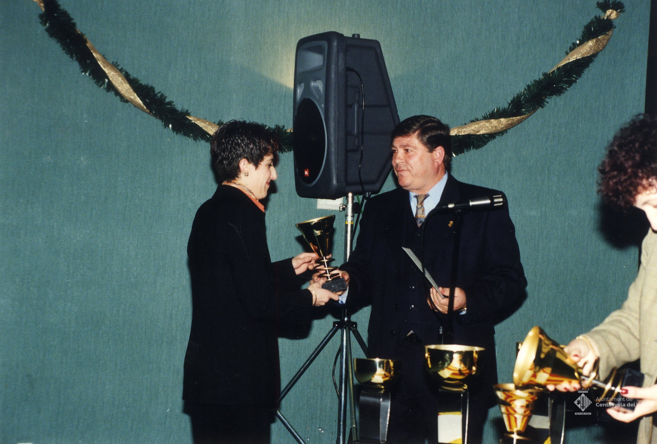 Cerimònia d'entrega de premis del concurs d'aparadors de Cerdanyola del Vallès presidida per l'alcaldessa Cristina Real Masdeu el gener de 1999