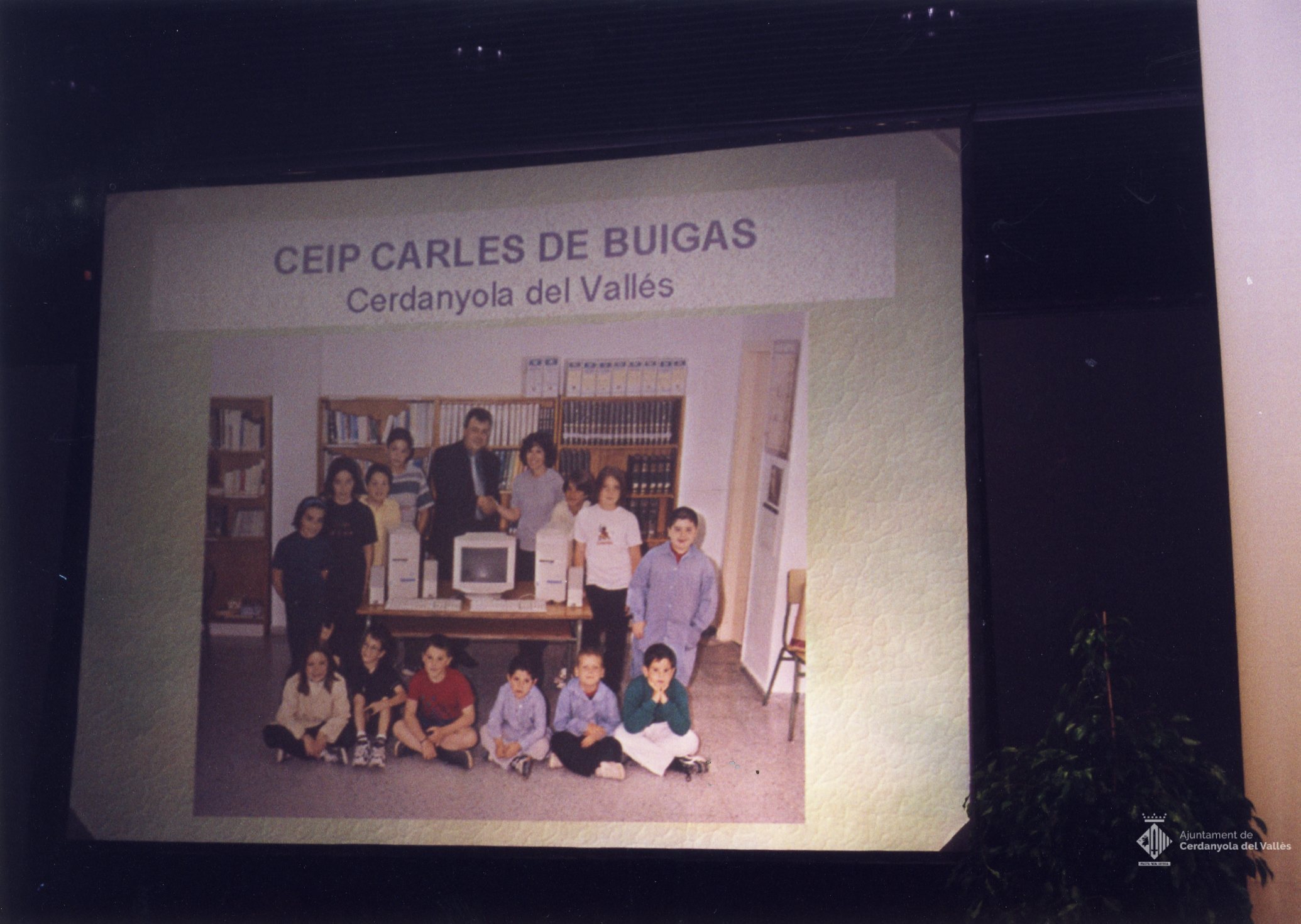 Col·lecta organitzada pel Grup Condis per subministrar ordinadors a les escoles de Cerdanyola del Vallès amb la presència de l'alcaldessa Cristina Real Madeu el juny de 2000