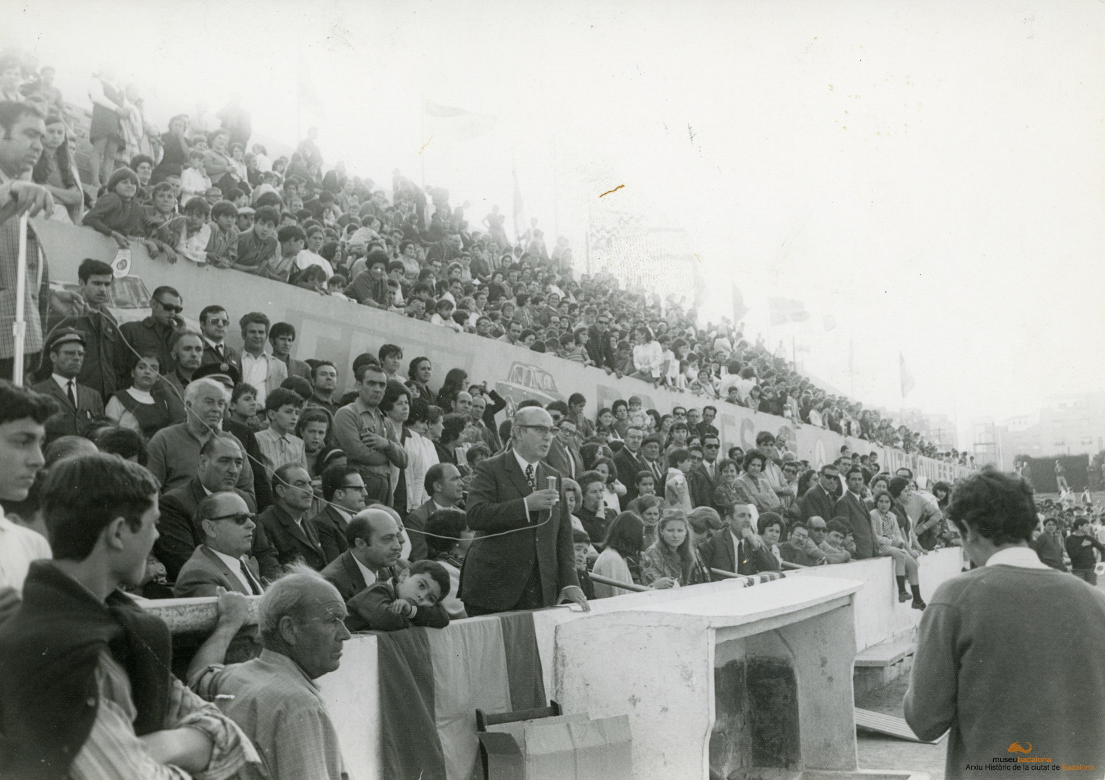 L'alcalde de Badalona, Felipe Antoja, al camp de futbol del CF Badalona, durant la II campaña de Iniciación al deporte