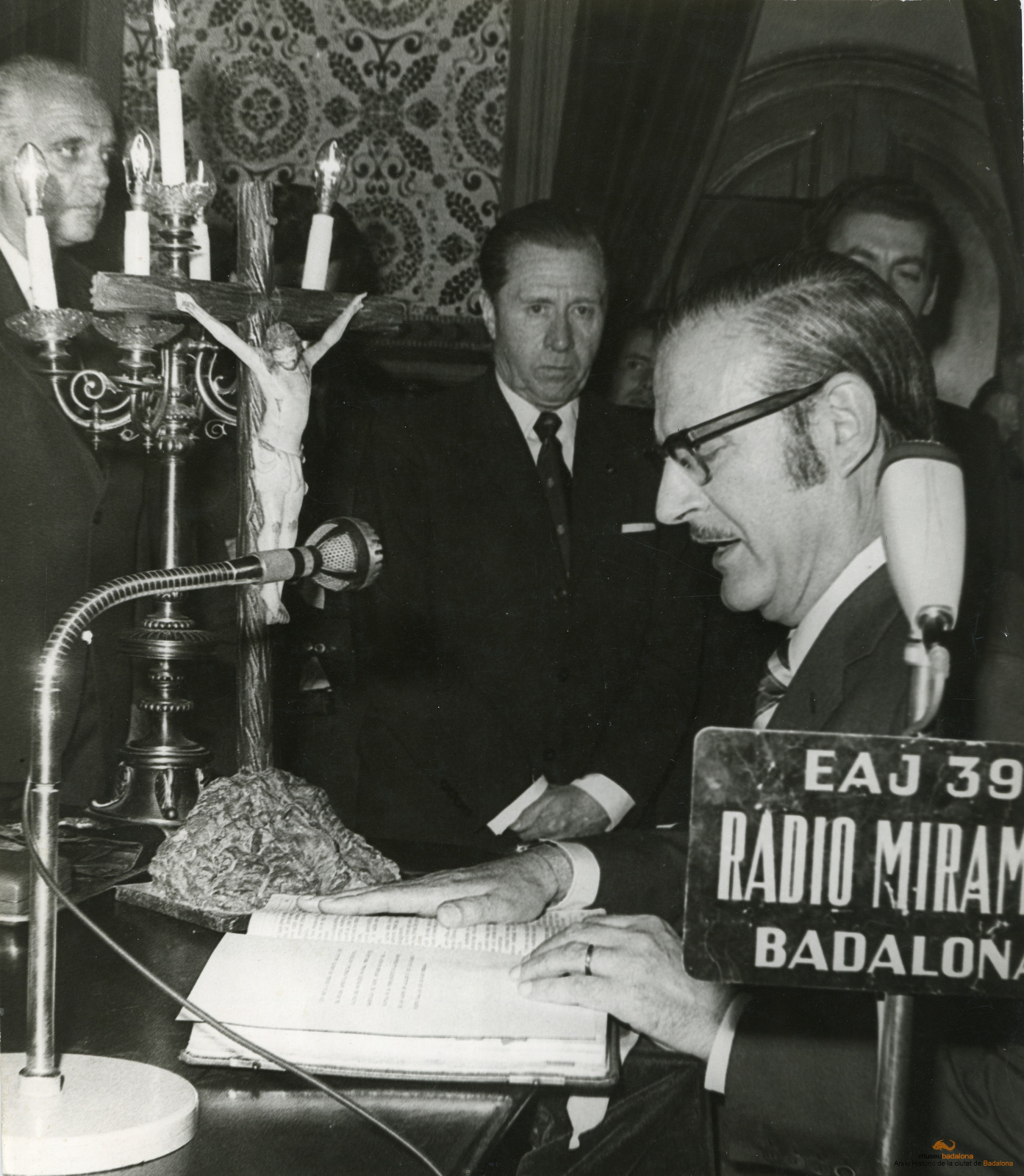Isidre Caballeria jurant el càrrec com a alcalde de Badalona. Hi ha un cricifix al costat del micròfon