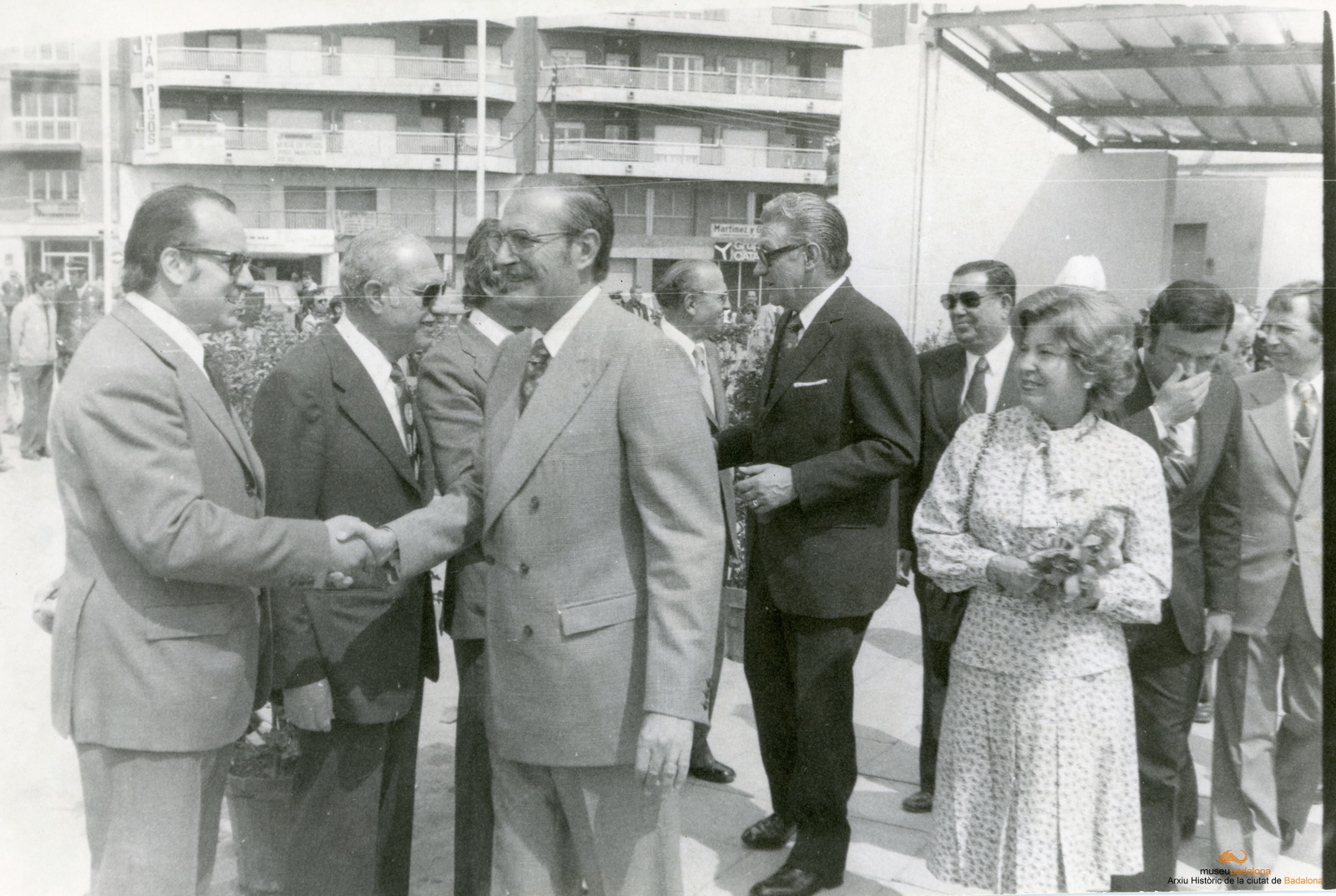 L'alcalde de Badalona Isidre Caballeria i altres a l'entrada de l'Exponente Industrial i Comercial saludant els organitzadors