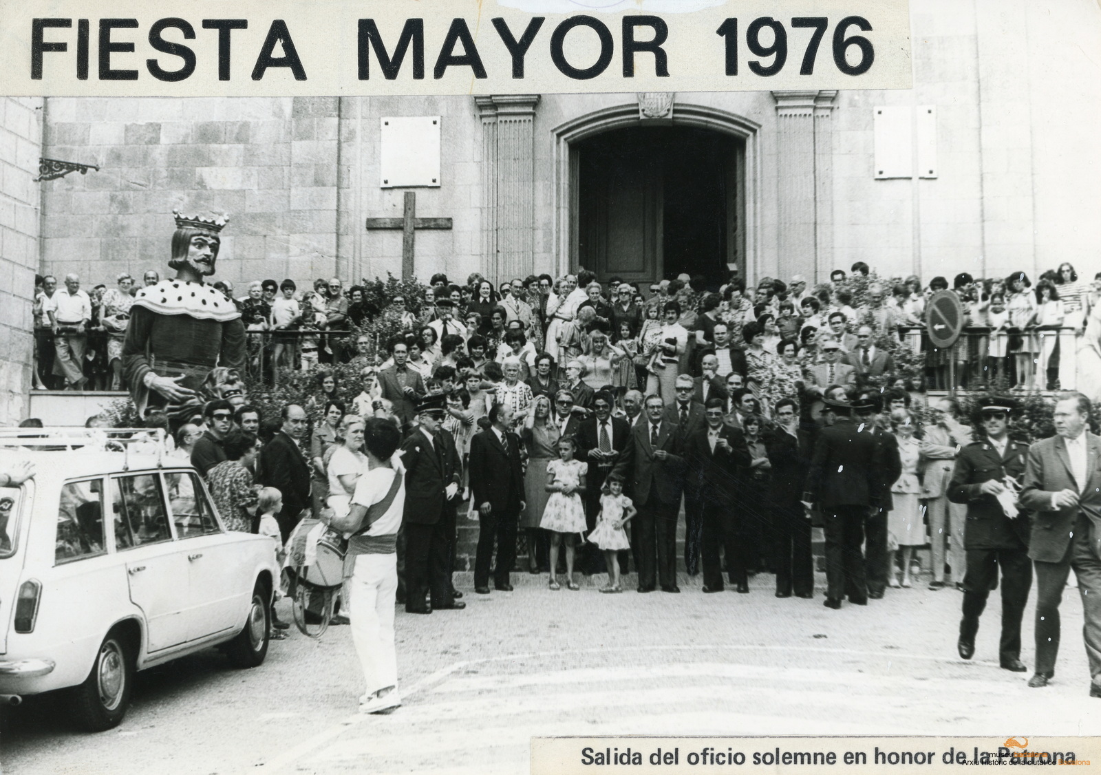 Davant l'església de Santa Maria, autoritats, gent i gegants a la sortida de l'ofici solemne en honor de Santa Maria