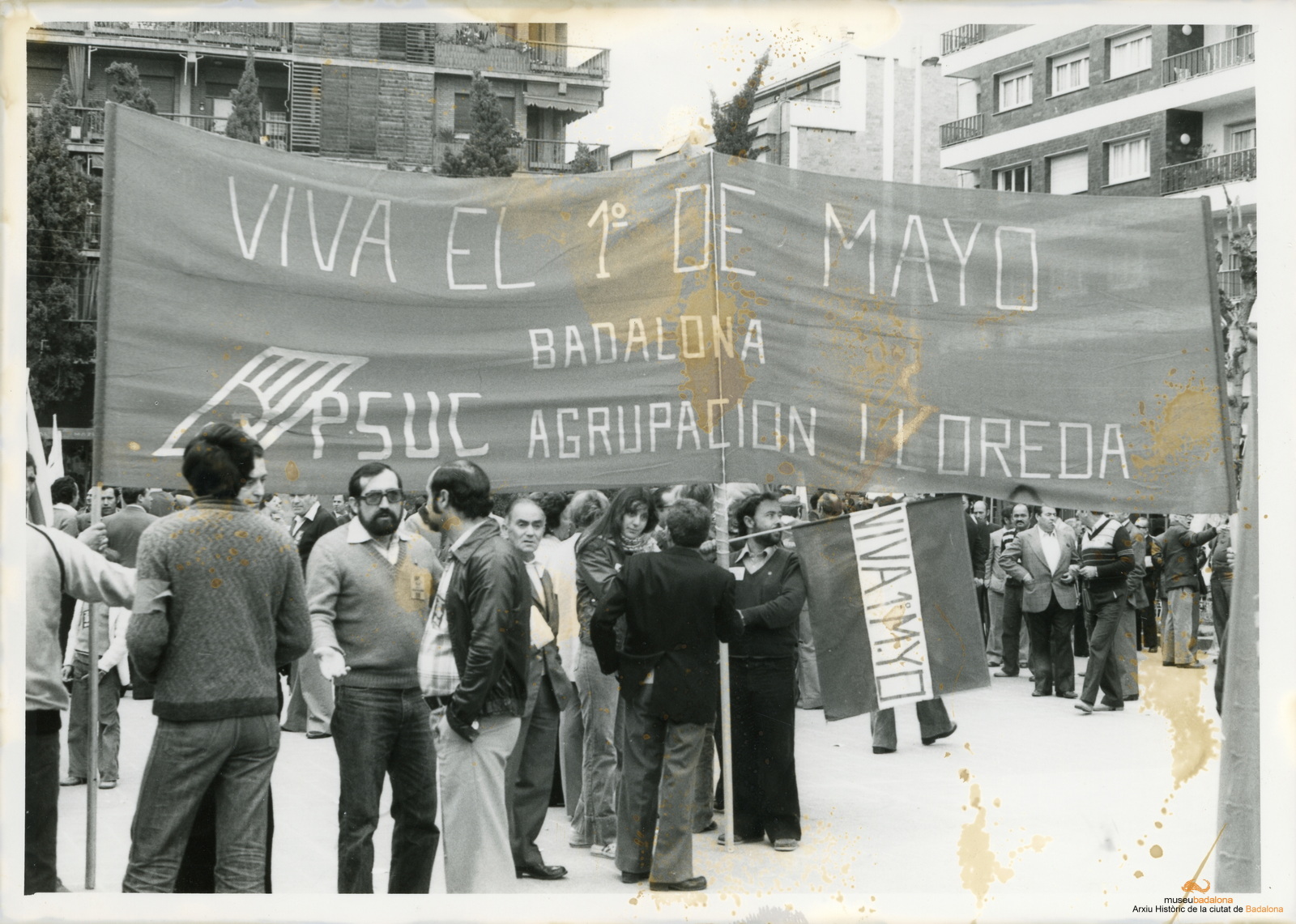 Primer de maig a La Plana. Gent concentrada i una gran pancarta referida a l'1 de maig