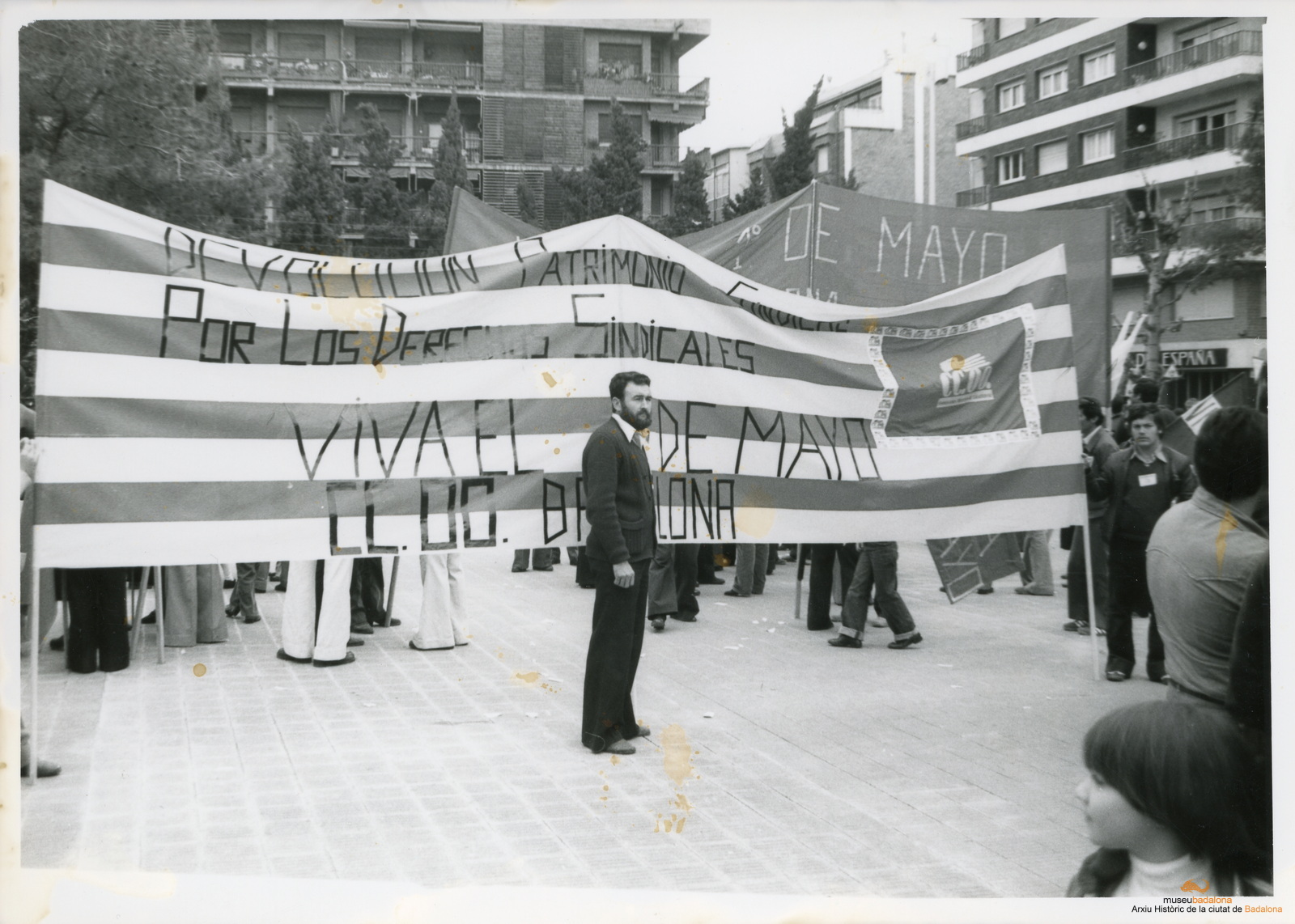 Primer de maig a La Plana. Gent concentrada i una gran pancarta referida a l'1 de maig