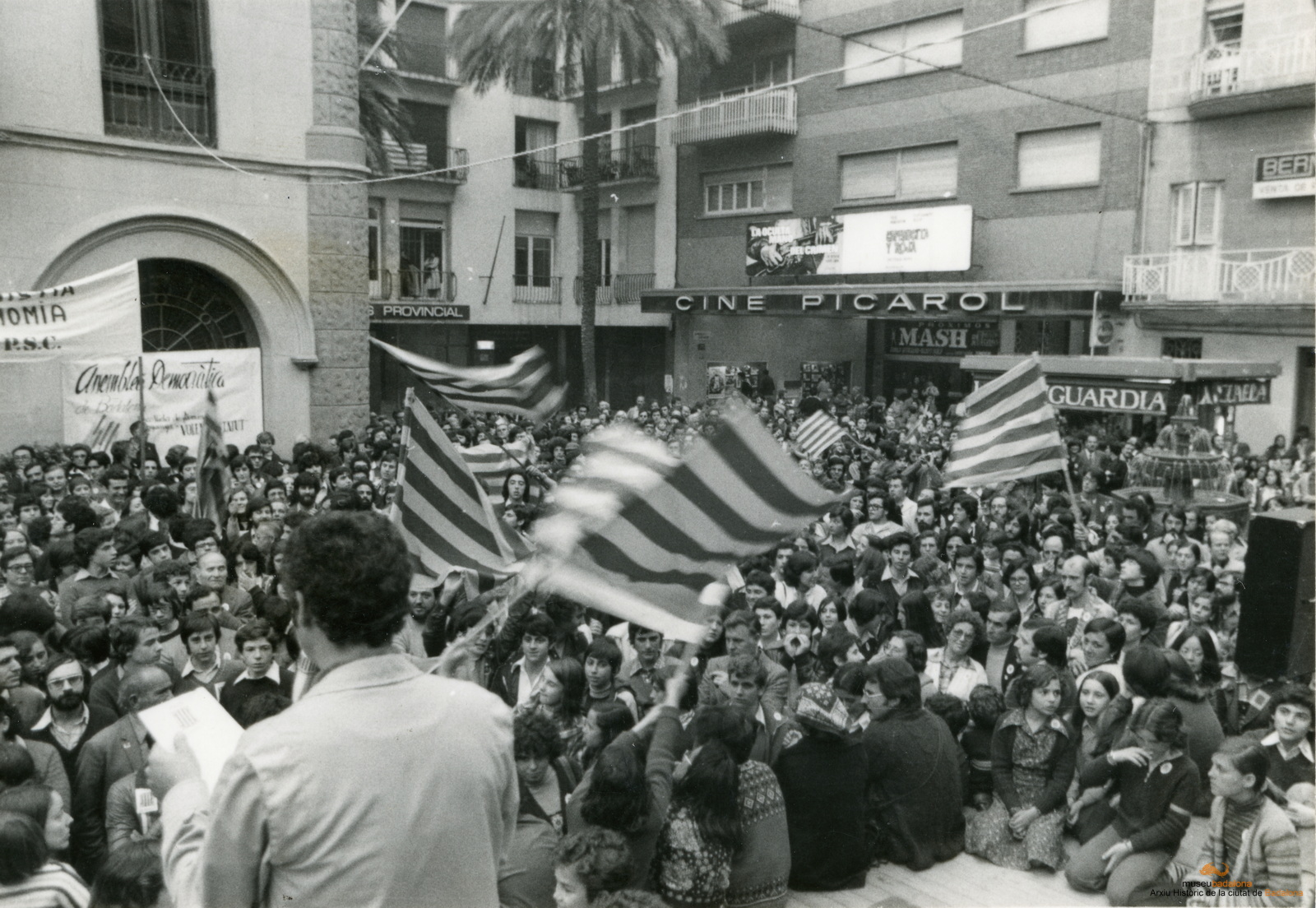 Manifestació a favor de l'Estatut a la plaça de la Vila. Vista general de la plaça amb la gent i de Joan Soler Amigó, d'esquena llegint un document