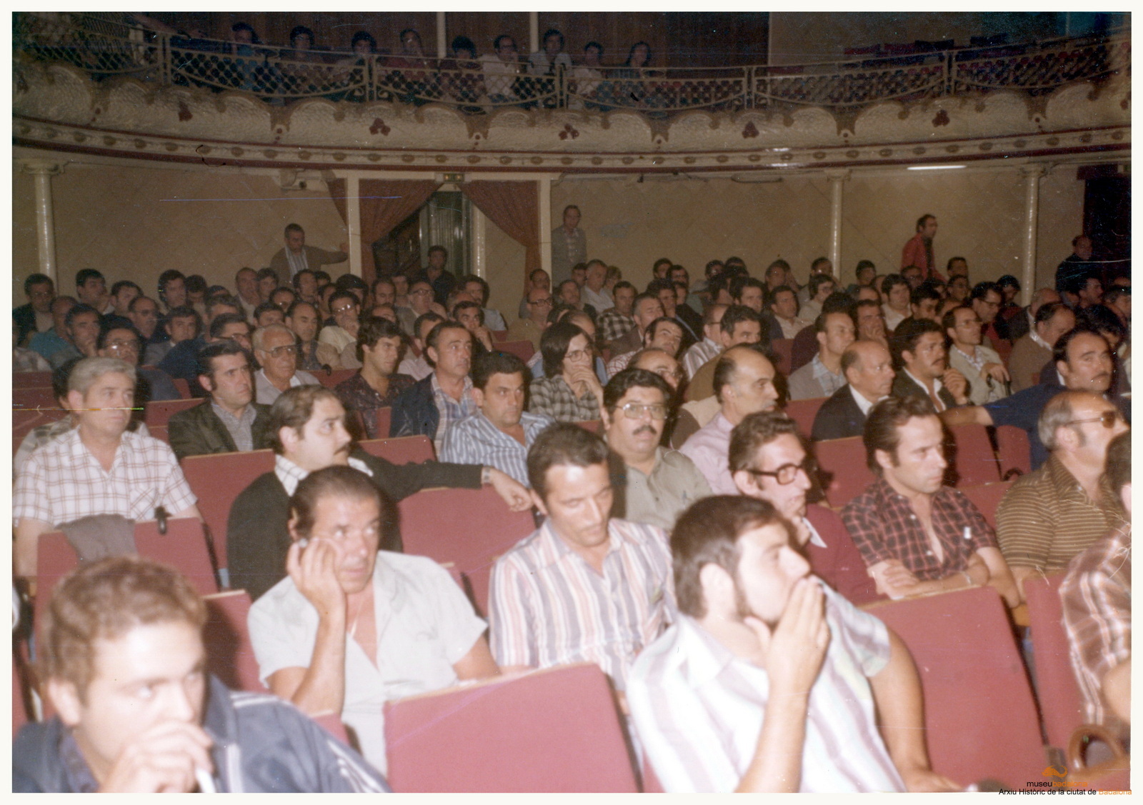 Vista general de la sala d'actes del Círcol Catòlic mentre se celebra una assemblea del C.F. Badalona