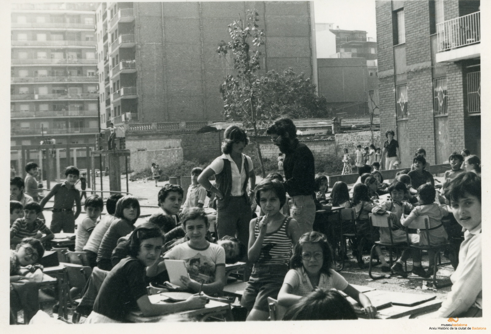 Gent fent classes al carrer de Juan Valera, al carrer, en acte de reivindicació d'escoles