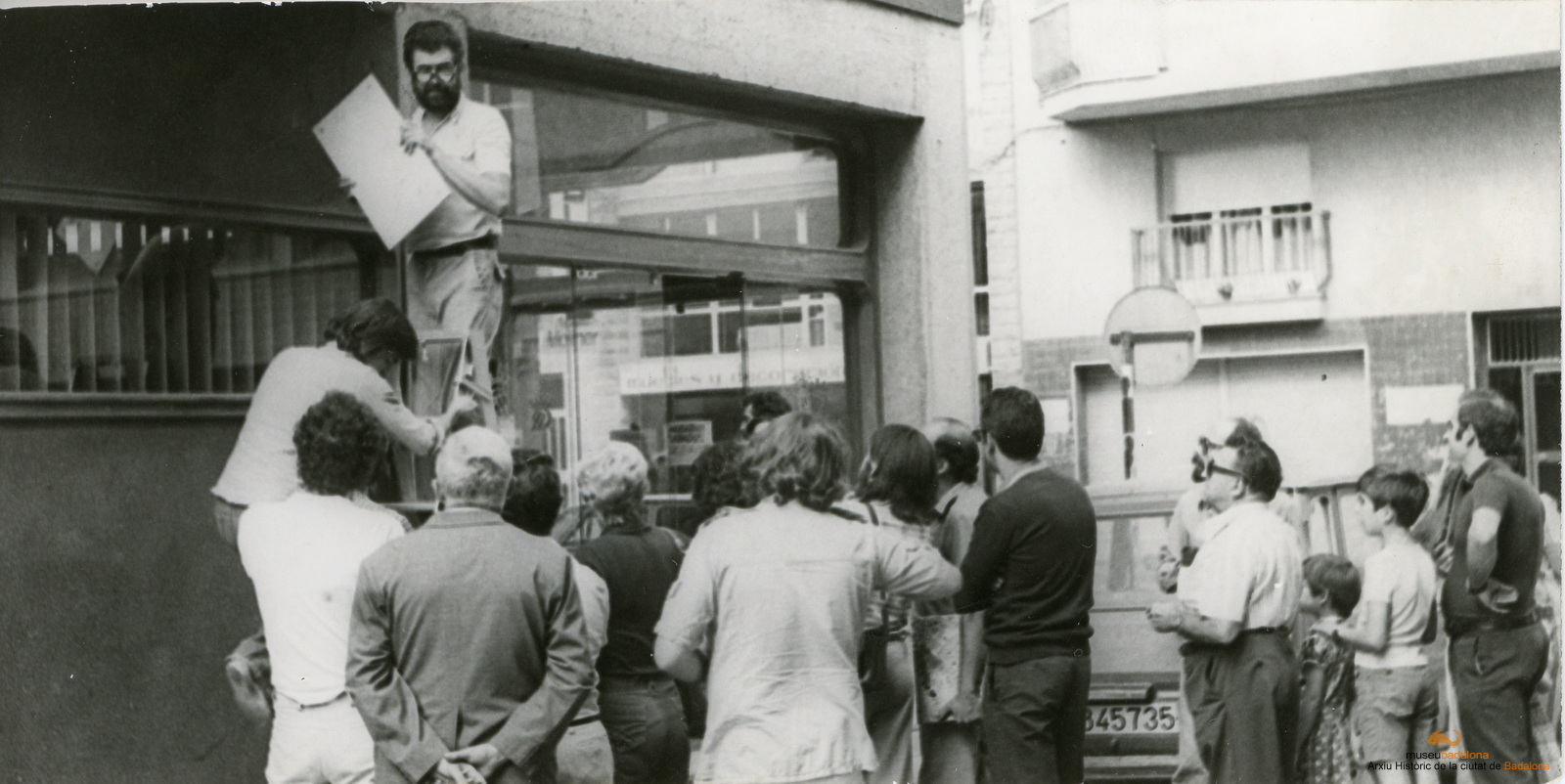 Antoni Serra, del PSC, enfilat a una escala, amb una placa a la mà, i un grup de gent acompanyant-lo, apunt de posar-la a un edifici amb el nom del carrer en català.