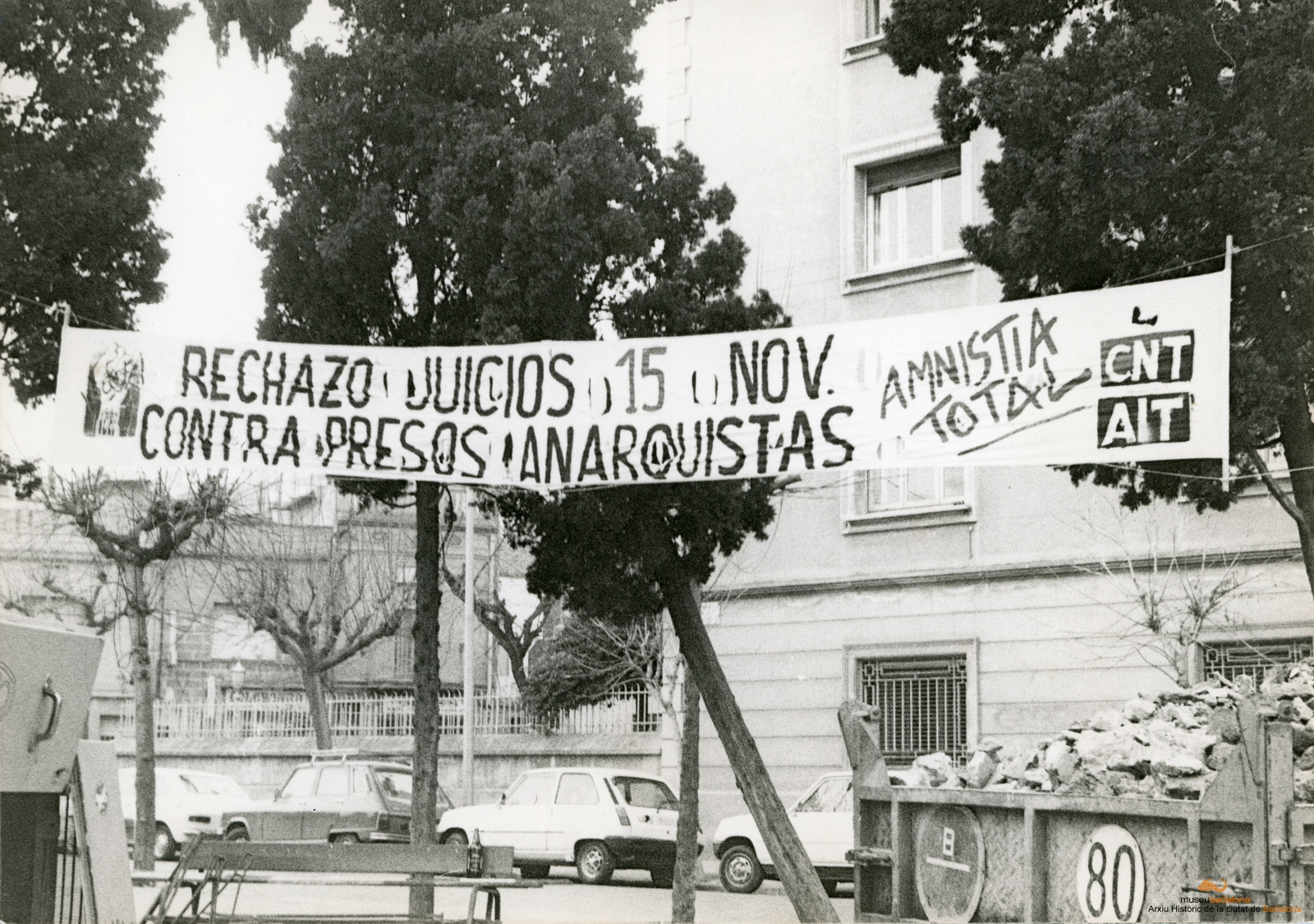 Pancarta penjada a la Rambla contra els judicis contra militants anarquistes
