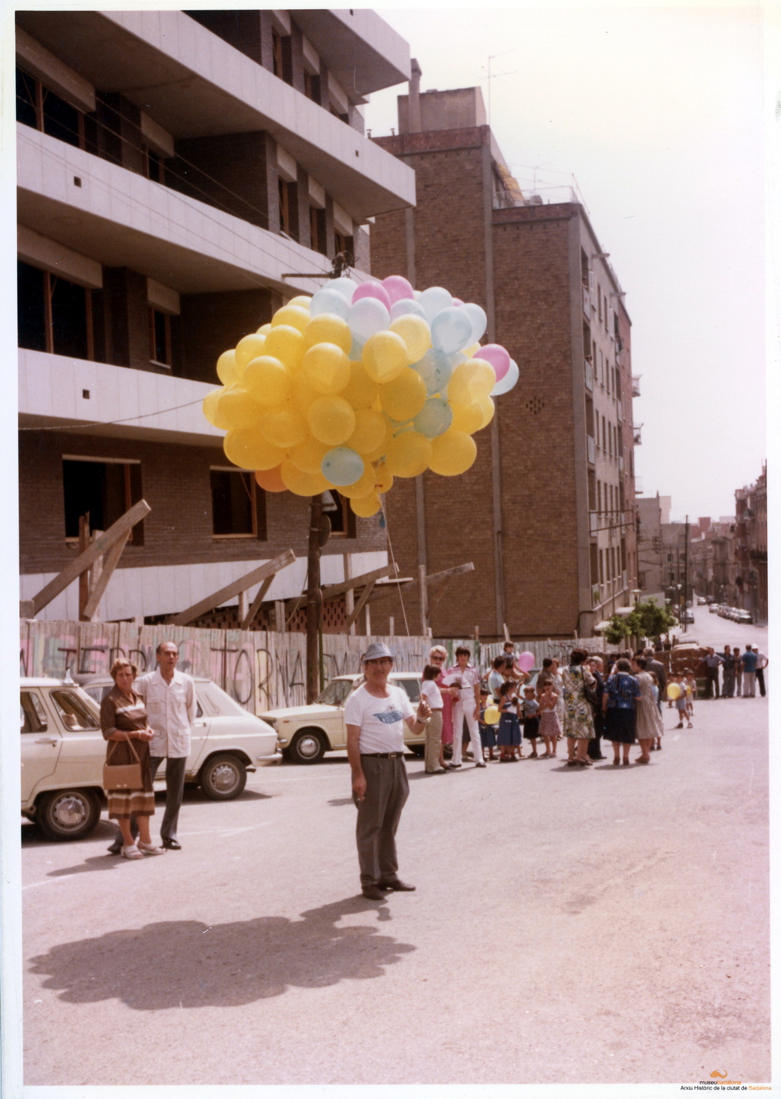 Festa major d'agost. El carrer del Temple amb un senyor amb un munt de glòbus. A l'esquerra es veuen els pisos a mig construir a l'espai darrera la Torre Vella