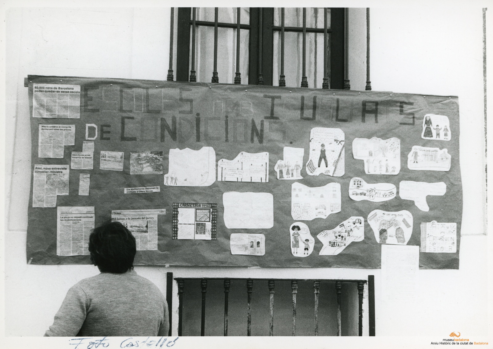Durant la celebració de la Festa del Badiu al mes de maig a Can Solei, persona mirant una pancarta on es demanen escoles amb igualtat de condicions