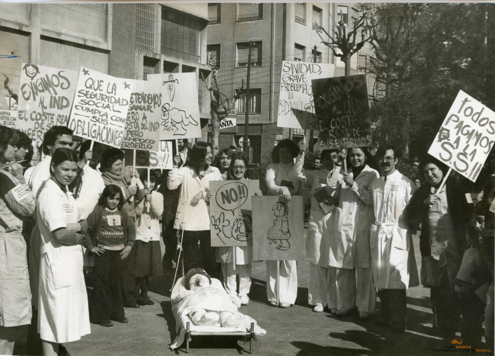Gent al carrer manifestant-se a la plaça de la Plana, amb pancartes, per temes relacionats amb la sanitat i la Seguretat Social