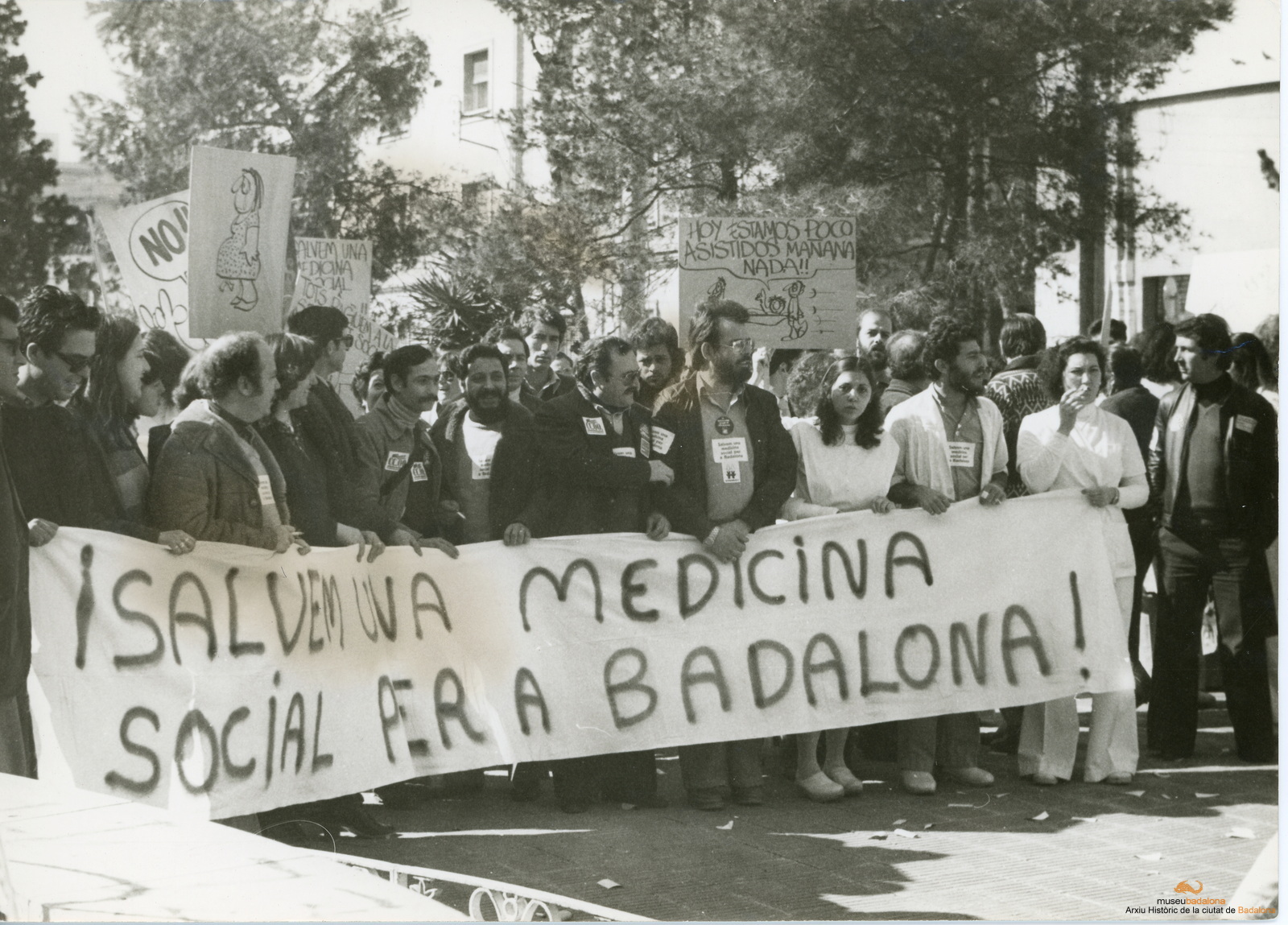 Gent al carrer manifestant-se a la plaça de la Plana, amb pancartes, per temes relacionats amb la sanitat i la Seguretat Social
