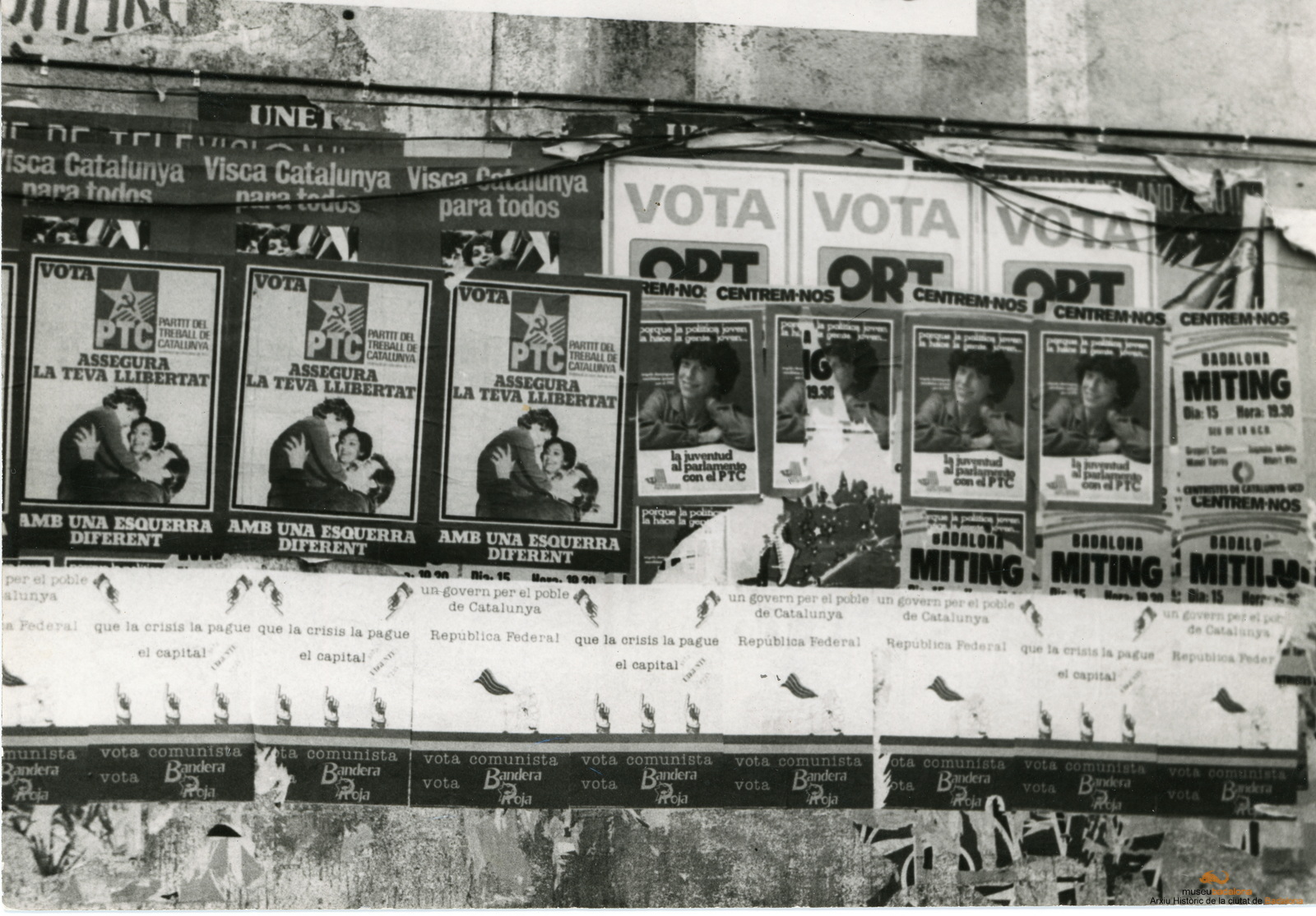 Paret amb cartells electorals del PTC, Bandera Roja i Centristes de Catalunya