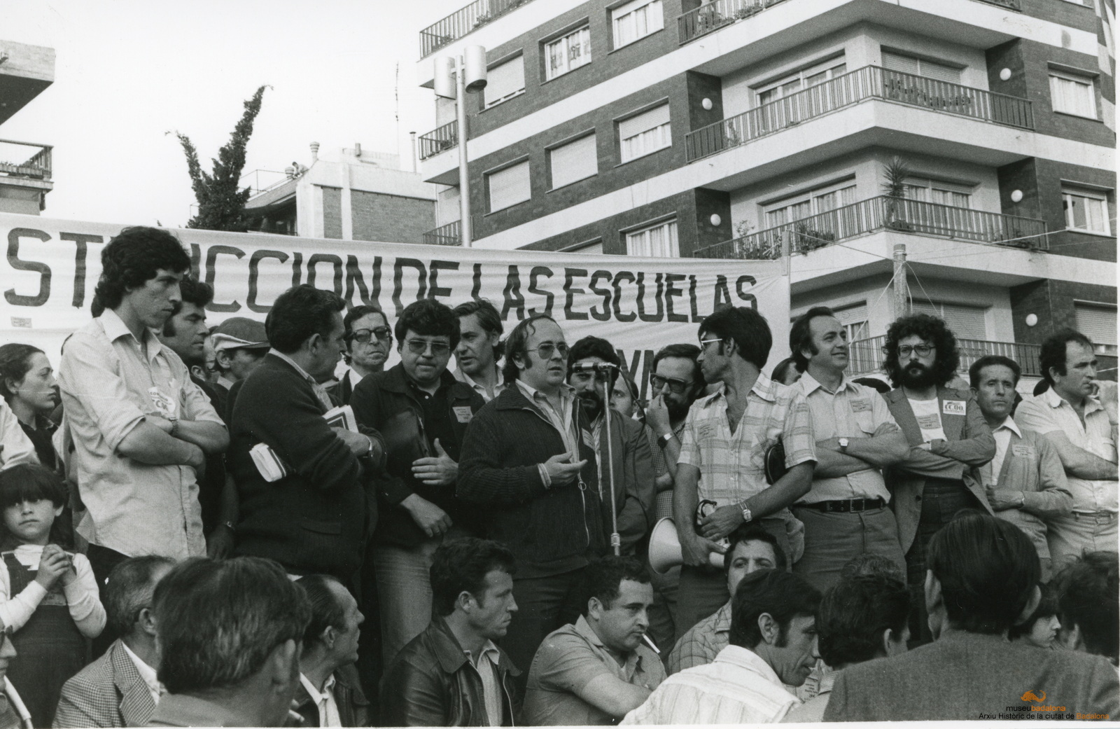 Grup de gent, encapçalada pels membres del consitori, a la Plana, en la manifestació unitària demanant escoles