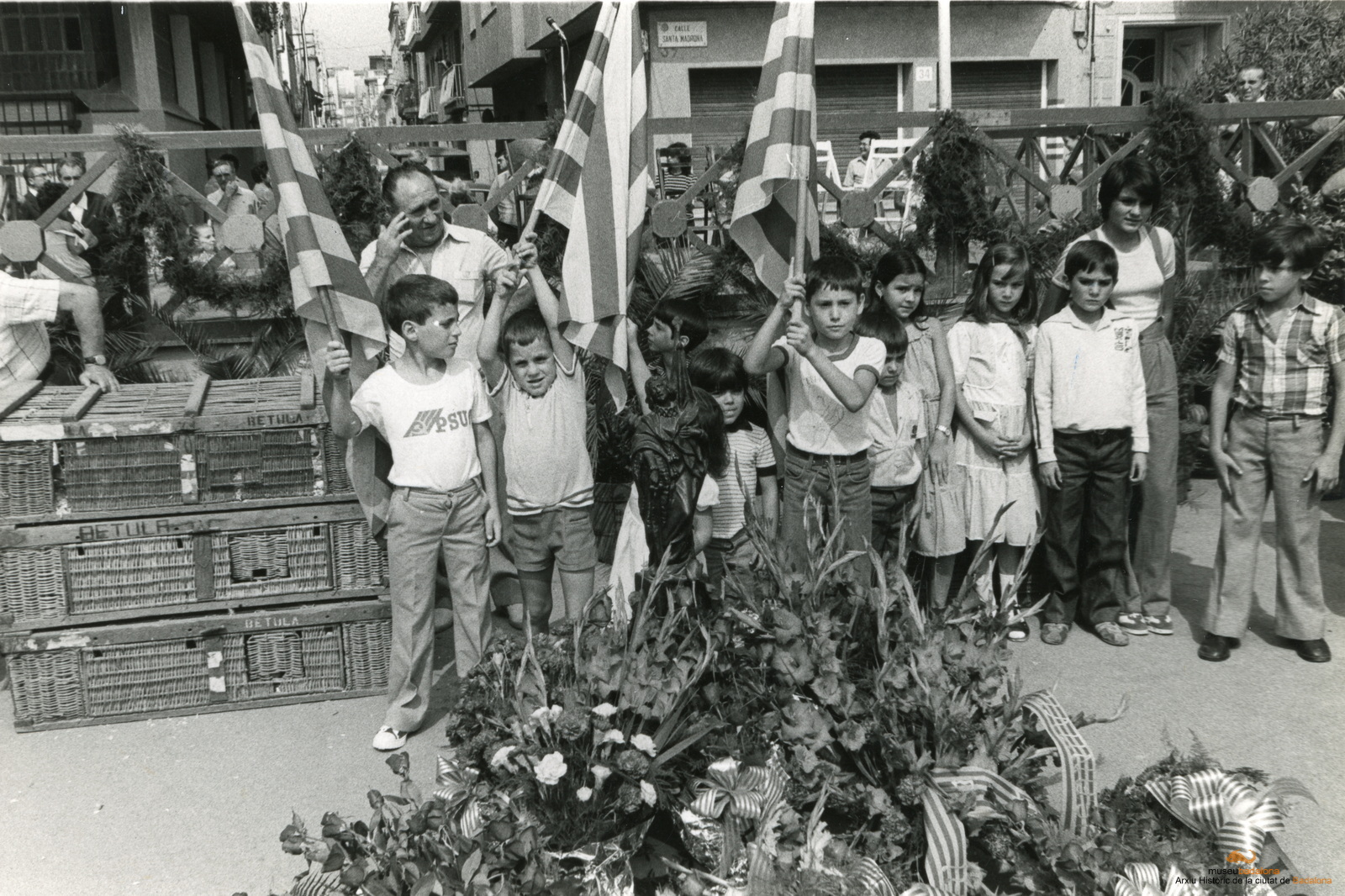 Grup de gent a la Rambla, per la celebració de l'acte en commemoració de l'11 de setembre. Caixes amb coloms missatgers