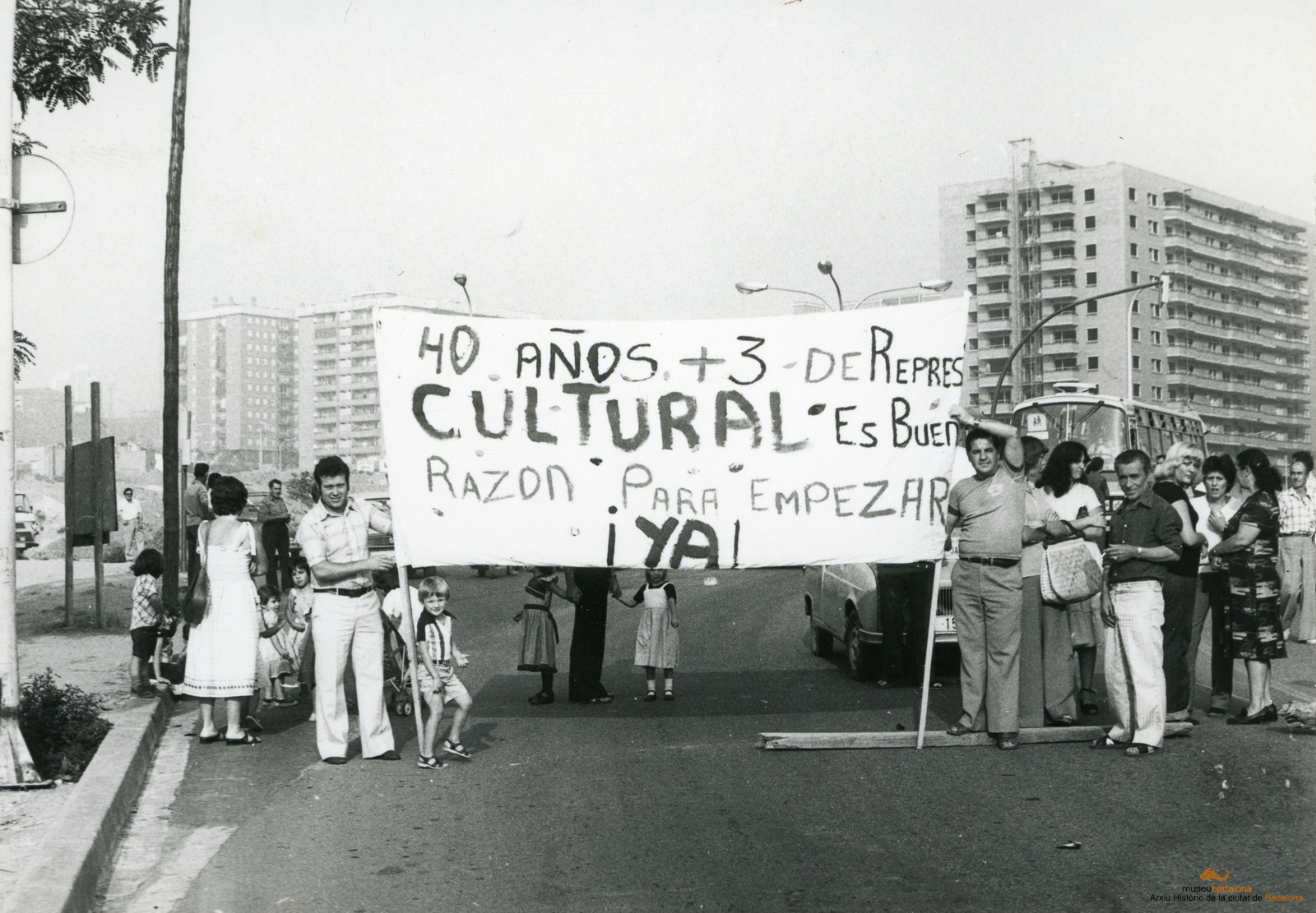 Gent al carrer, al barri de Nova Lloreda, amb pancarta, reclamant l'assignació de mestres que no tenen