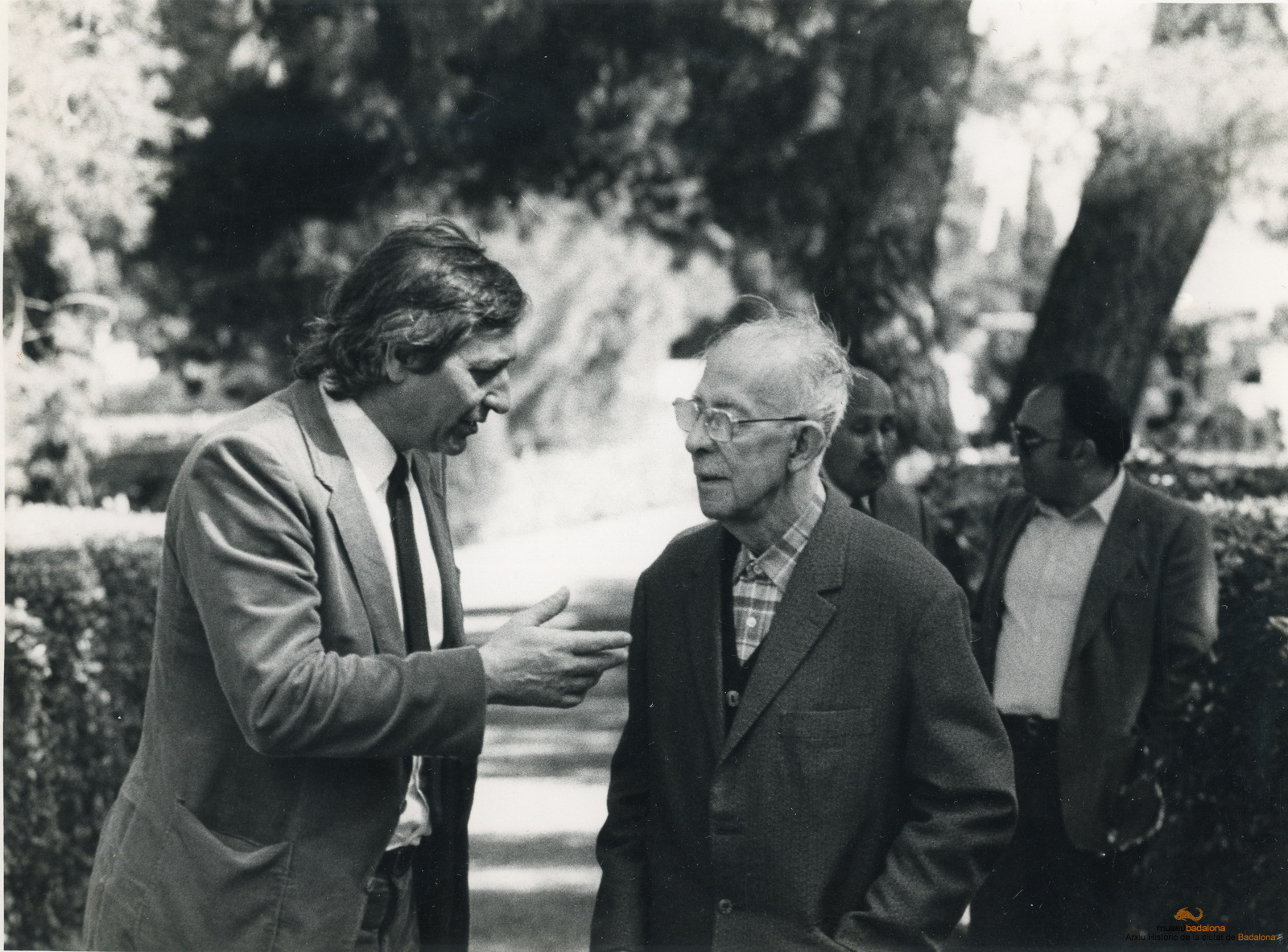 L'alcalde Màrius Díaz Bielsa convensant amb l'alcalde Joan Manent Pesas a Prada de Conflent durant una visita que l'alcalde Díaz va fer a l'alcalde Manent. Al darrera d'ells, Campos i Josep Oliveras