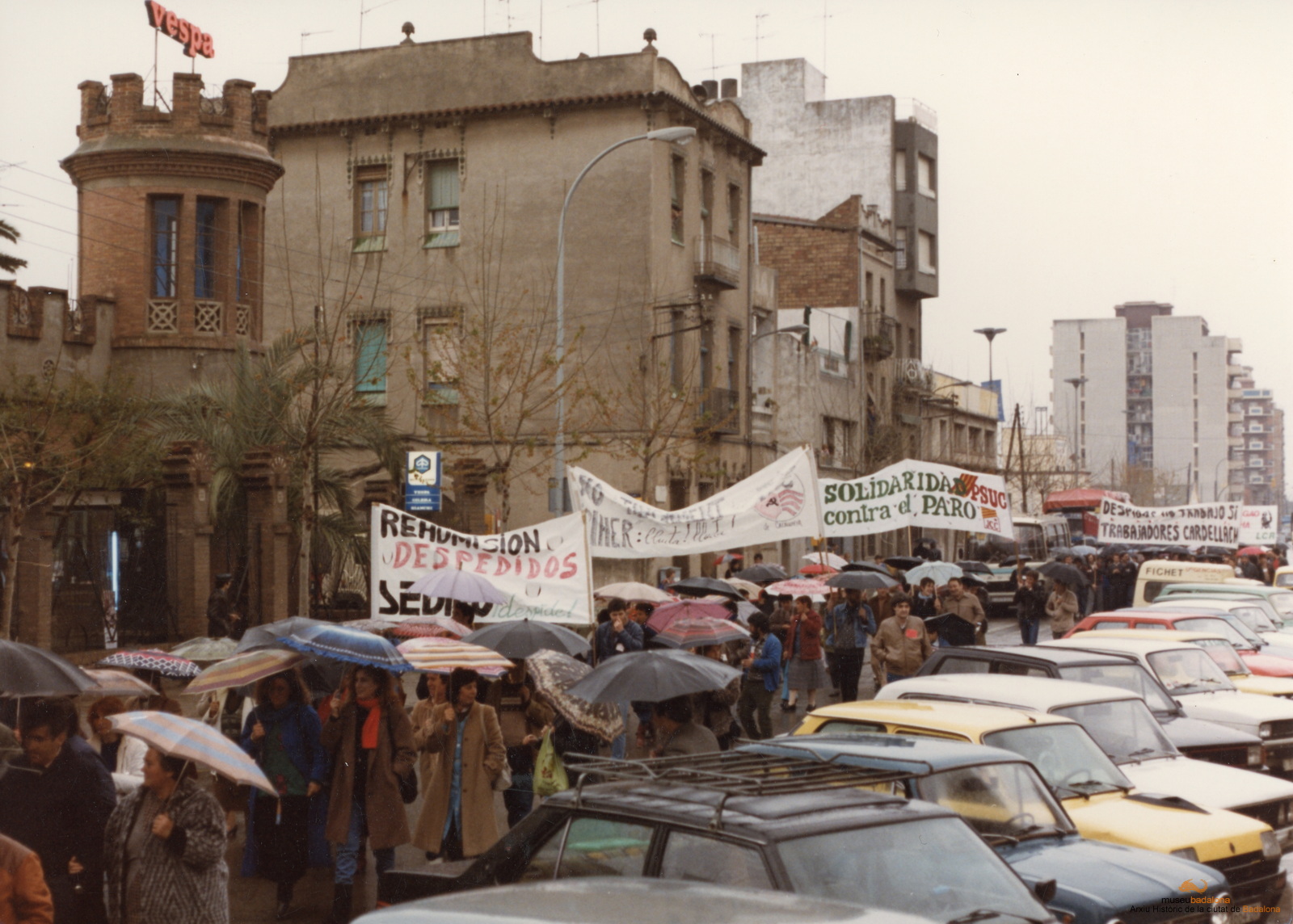 Gent manifestant-se amb pancartes a Pep Ventura contra l'atur i els acomiadaments de l'empresa Cardellach