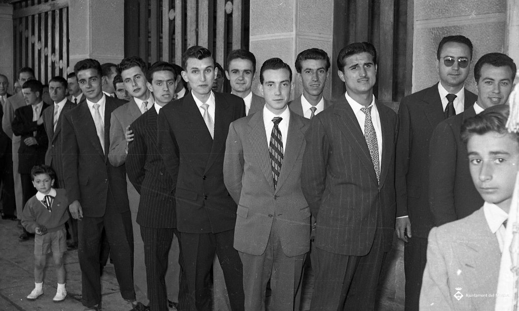 Grup de joves del poble fent cua per entrar en algun acte. D'esquerra a dreta: ?, ?, ?, Enric Garcia Duran, Joan Vidal Xicapila, ?, Conesa, Bach, Ferran Flo, Francesc Alemany i ?. Igual a la foto 1406.