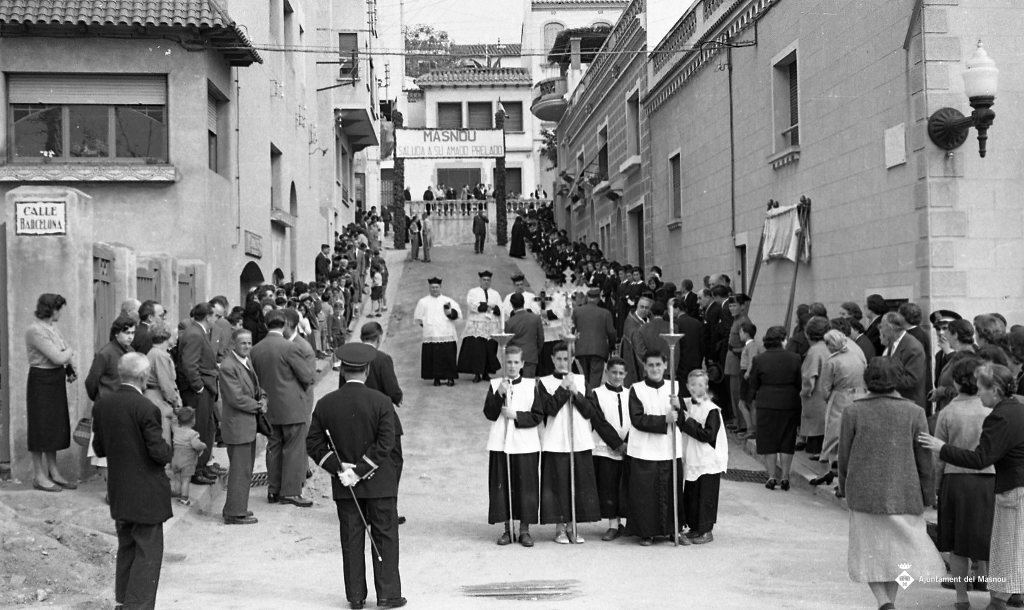 Carrer de la Mare de Déu del Carme. Al fons cartell que diu Masnou / saluda a su amado prelado