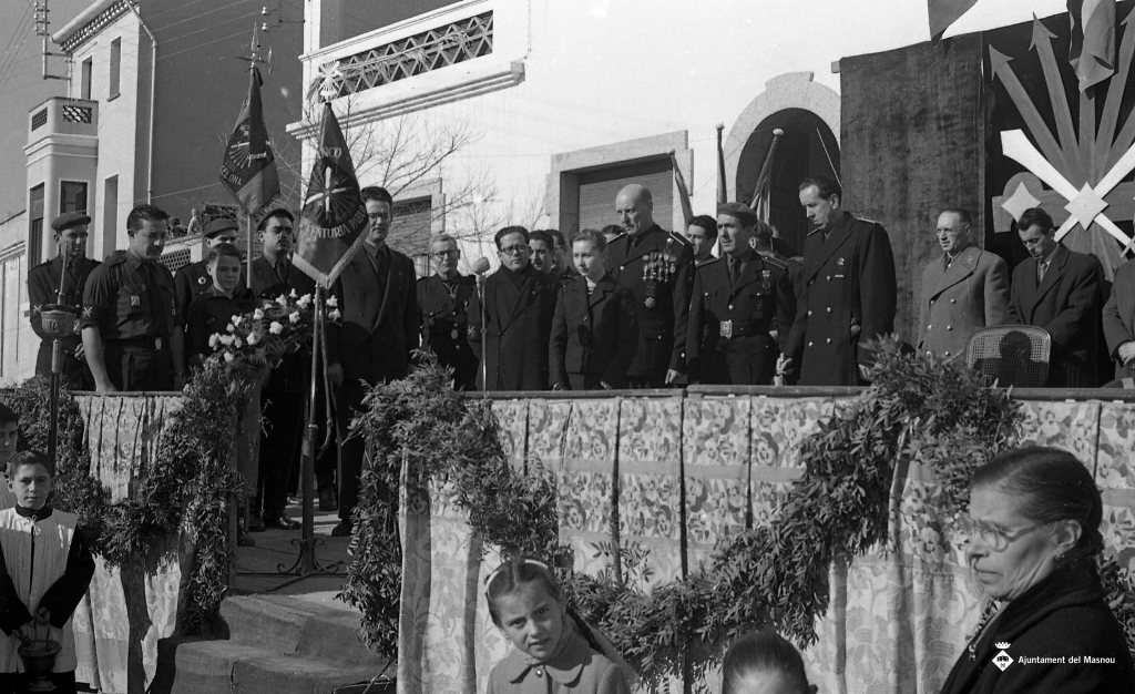 Falange. Maria Dolors Salazar Cortada, filla de l'alcalde Salazar, amb autoritats.