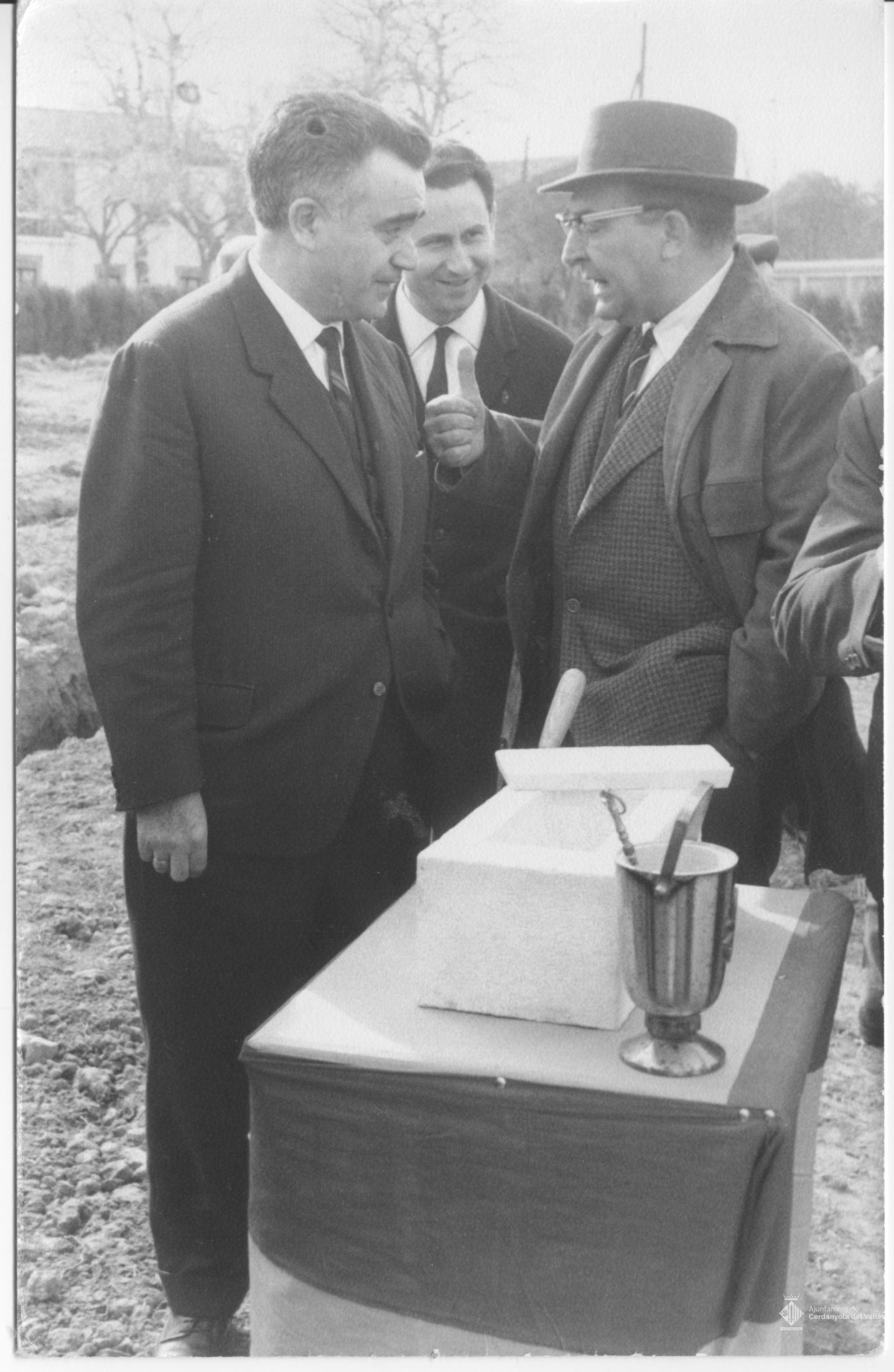 Acte de primera pedra i benedicció de les obres de construcció del Grupo Escolar Nacional San Martín (actual Escola Sant Martí) a Cerdanyola del Vallès presidit per l'alcalde Domingo Fatjó Sanmiquel i beneit pel rector Juan Gili Doria el 26 de gener de 1966