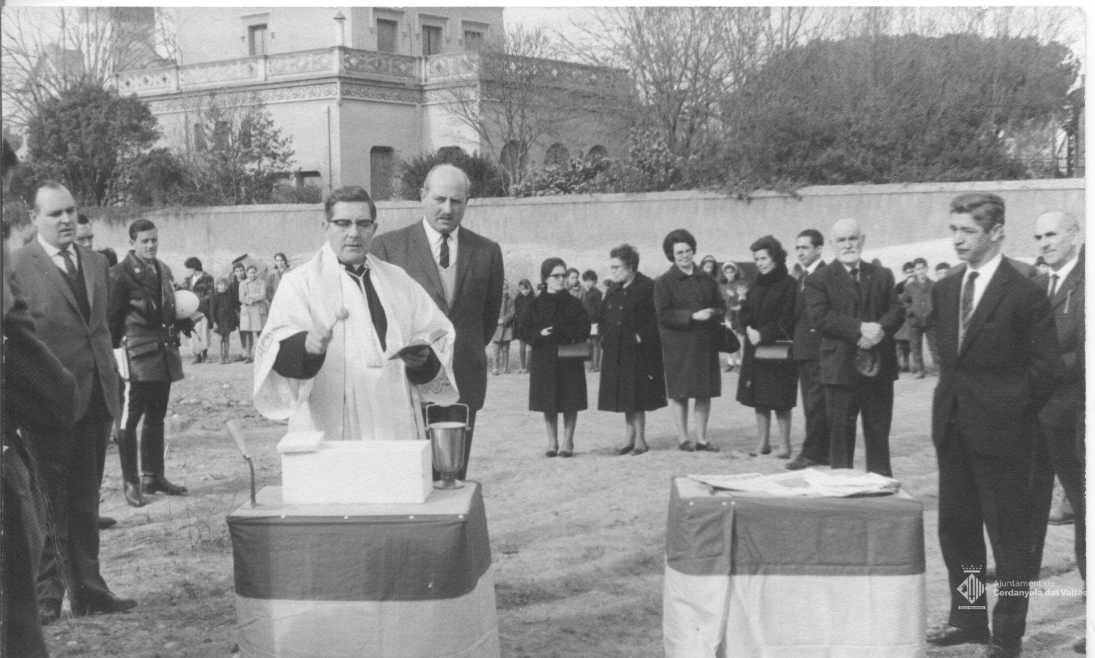 Acte de primera pedra i benedicció de les obres de construcció del Grupo Escolar Nacional San Martín (actual Escola Sant Martí) a Cerdanyola del Vallès presidit per l'alcalde Domingo Fatjó Sanmiquel i beneit pel rector Juan Gili Doria el 26 de gener de 1966