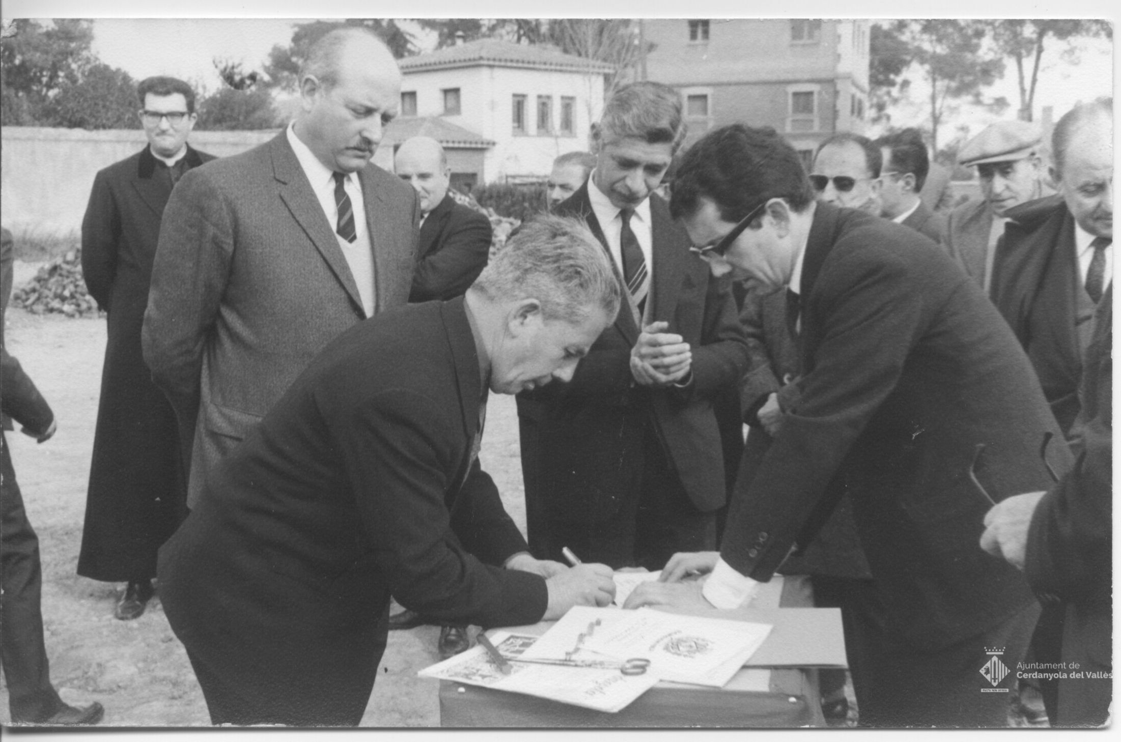 Acte de primera pedra i benedicció de les obres de construcció del Grupo Escolar Nacional San Martín (actual Escola Sant Martí) a Cerdanyola del Vallès presidit per l'alcalde Domingo Fatjó Sanmiquel i beneit pel rector Juan Gili Doria el 26 de gener de 1966