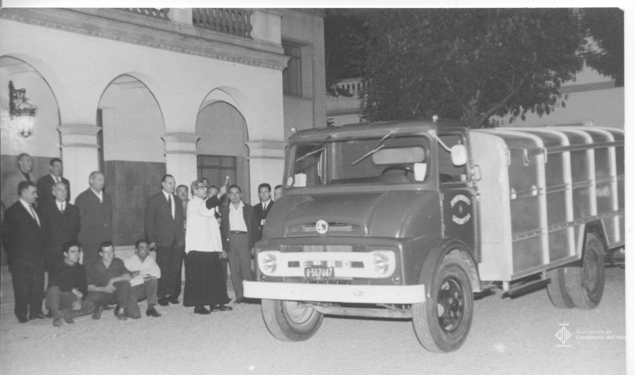 Cerimònia de benedicció del camió del servei de neteja municipal de l'Ajuntament de Cerdanyola del Vallès amb la presència de l'alcalde Domingo Fatjó Sanmiquel i el rector Juan Gili Doria la dècada de 1960