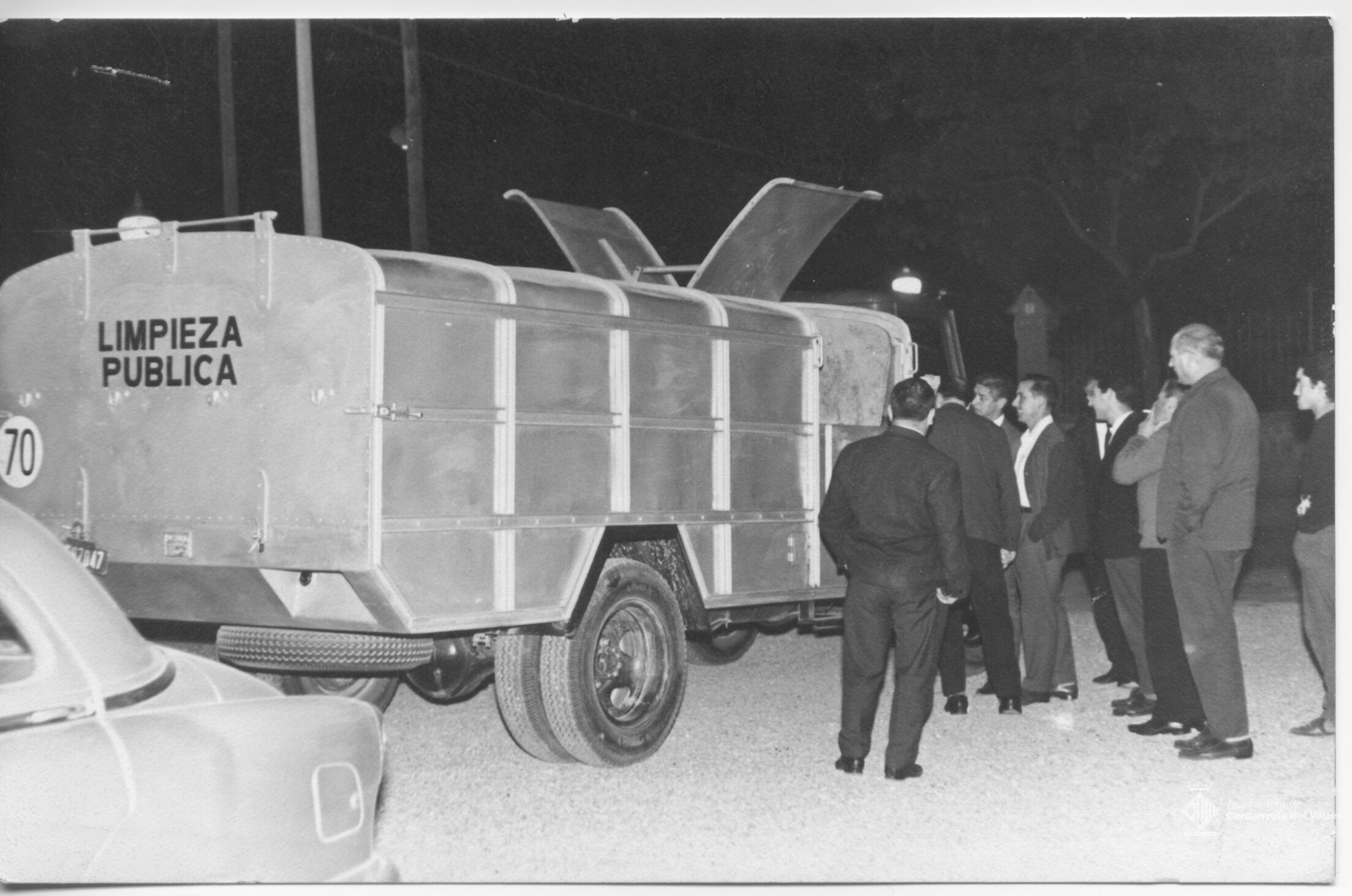 Cerimònia de benedicció del camió del servei de neteja municipal de l'Ajuntament de Cerdanyola del Vallès amb la presència de l'alcalde Domingo Fatjó Sanmiquel i el rector Juan Gili Doria la dècada de 1960