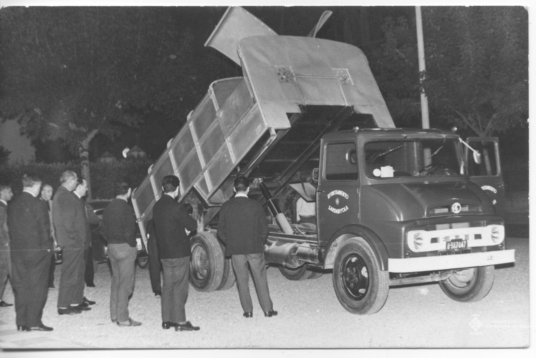 Cerimònia de benedicció del camió del servei de neteja municipal de l'Ajuntament de Cerdanyola del Vallès amb la presència de l'alcalde Domingo Fatjó Sanmiquel i el rector Juan Gili Doria la dècada de 1960