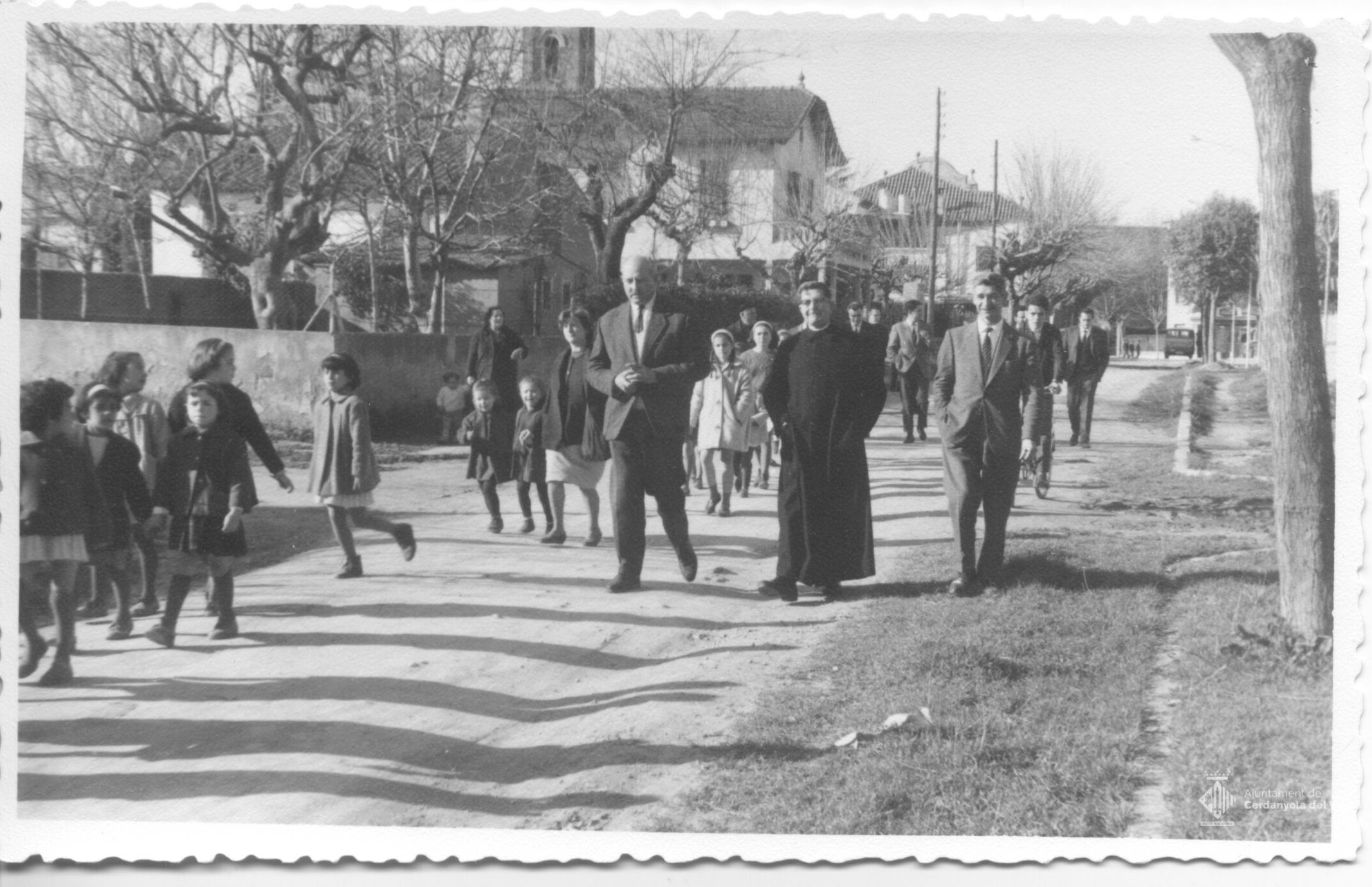 Excursió d'escolars de Cerdanyola del Vallès acompanyats per l'alcalde Domingo Fatjó Sanmiquel i el rector Juan Gili Doria la dècada de 1960