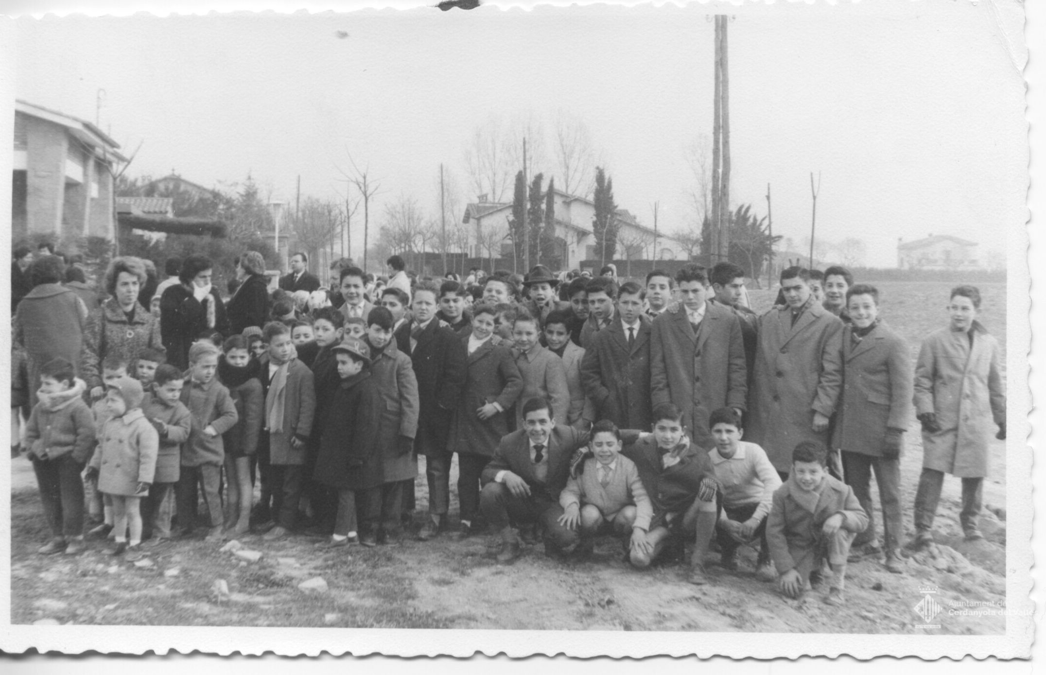 Excursió d'escolars de Cerdanyola del Vallès acompanyats per l'alcalde Domingo Fatjó Sanmiquel i el rector Juan Gili Doria la dècada de 1960