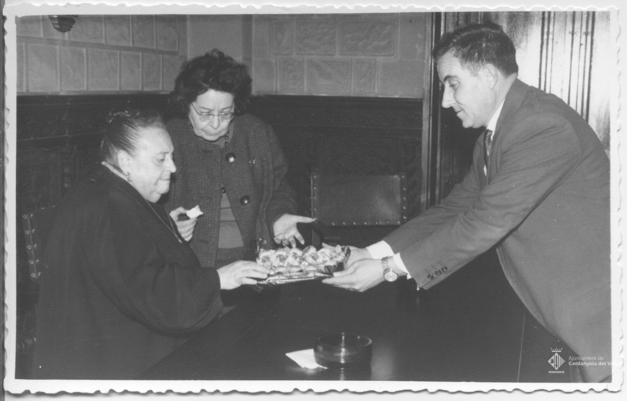 Acte d'homenatge a la gent gran de Cerdanyola del Vallès celebrat a la sala del ple de l'ajuntament amb la presència de l'alcalde Domingo Fatjó Sanmiquel i el rector Juan Gili Doria la dècada de 1960