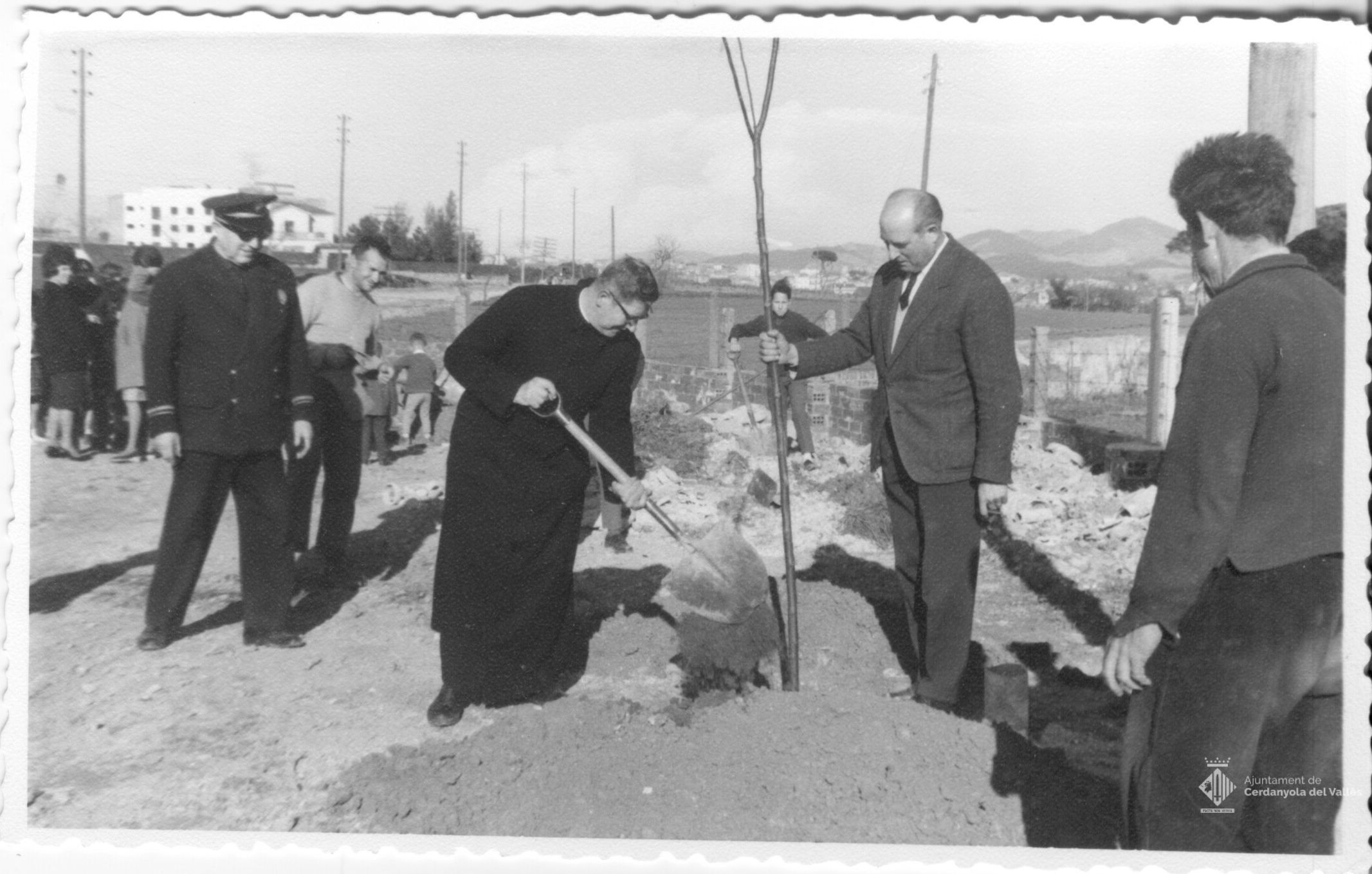 Escolars planten arbres a Cerdanyola del Vallès amb la presència de l'alcalde Domingo Fatjó Sanmiquel la dècada de 1960