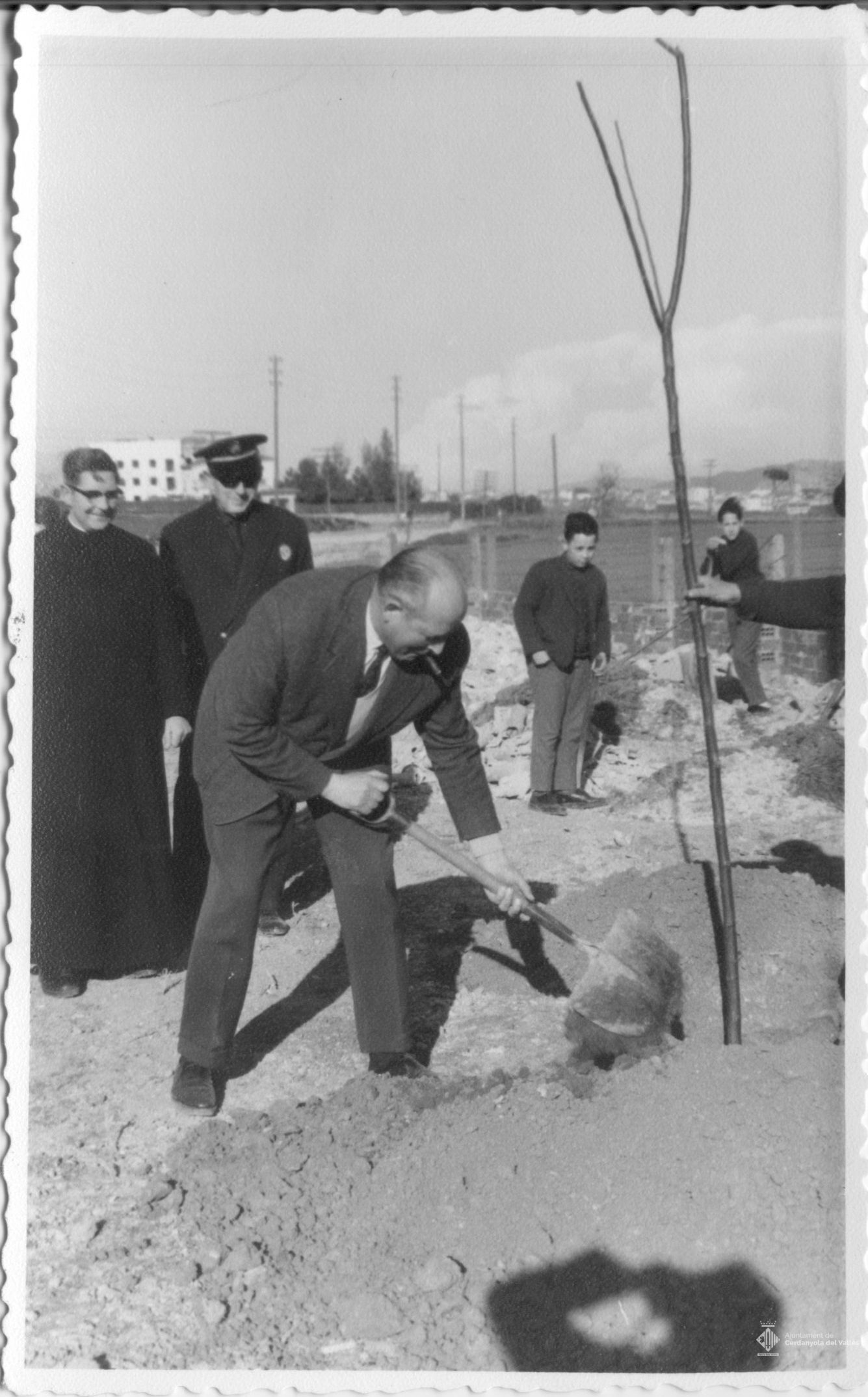 Escolars planten arbres a Cerdanyola del Vallès amb la presència de l'alcalde Domingo Fatjó Sanmiquel la dècada de 1960