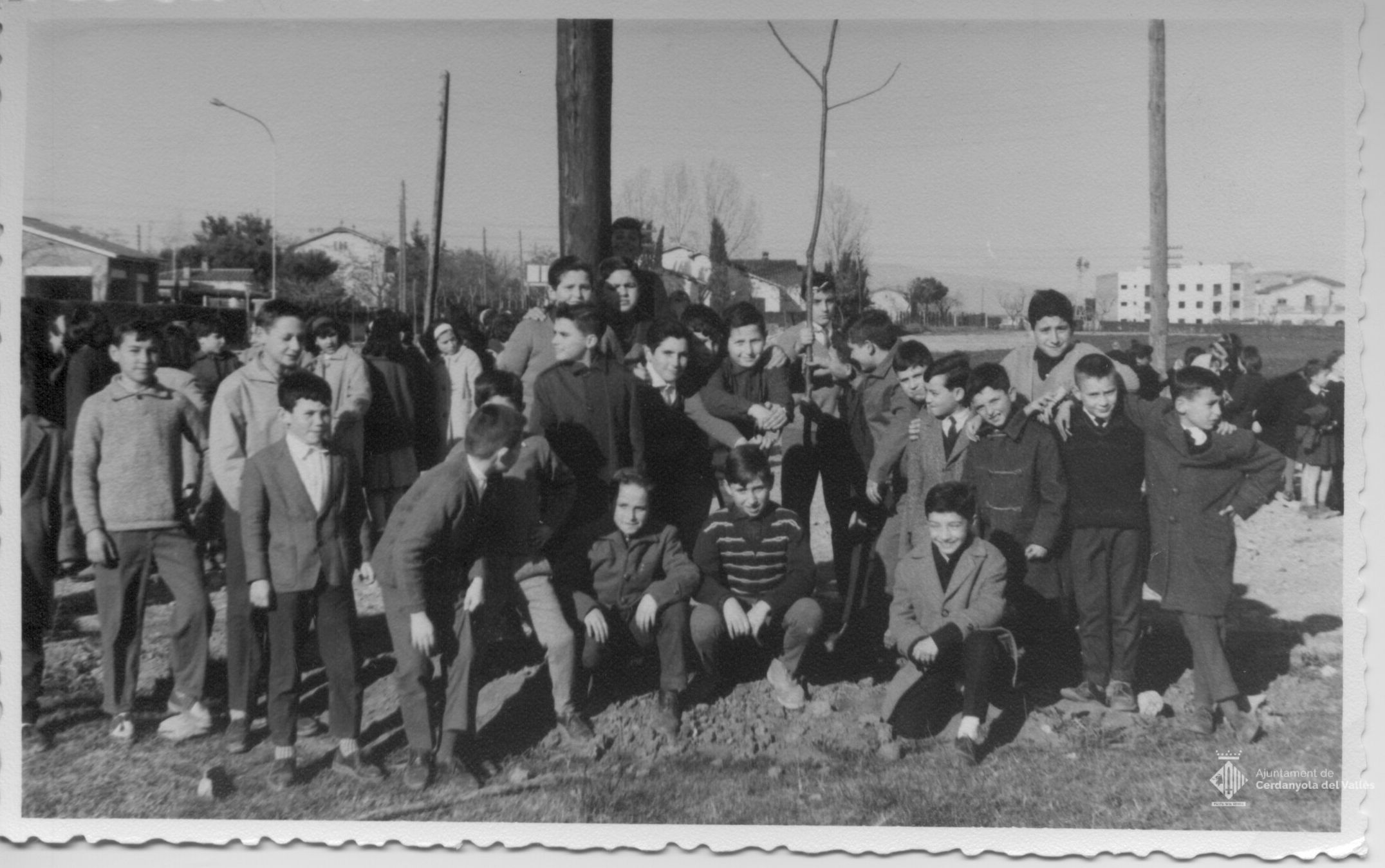 Escolars planten arbres a Cerdanyola del Vallès amb la presència de l'alcalde Domingo Fatjó Sanmiquel la dècada de 1960