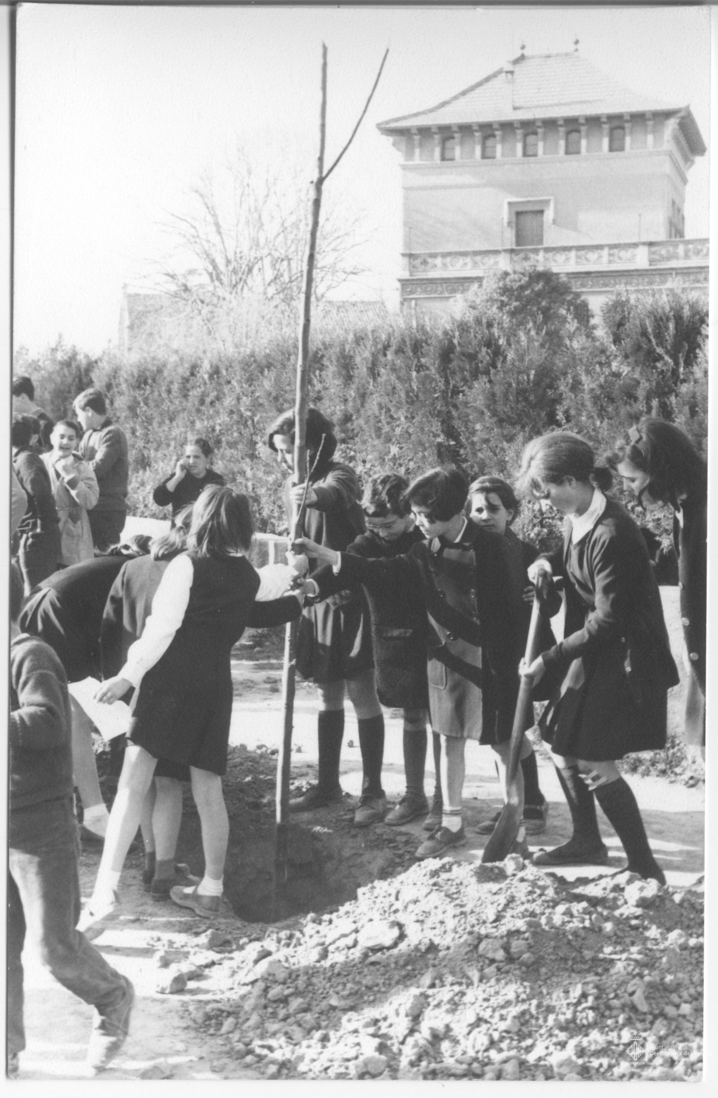Escolars planten arbres a Cerdanyola del Vallès amb la presència de l'alcalde Domingo Fatjó Sanmiquel la dècada de 1960