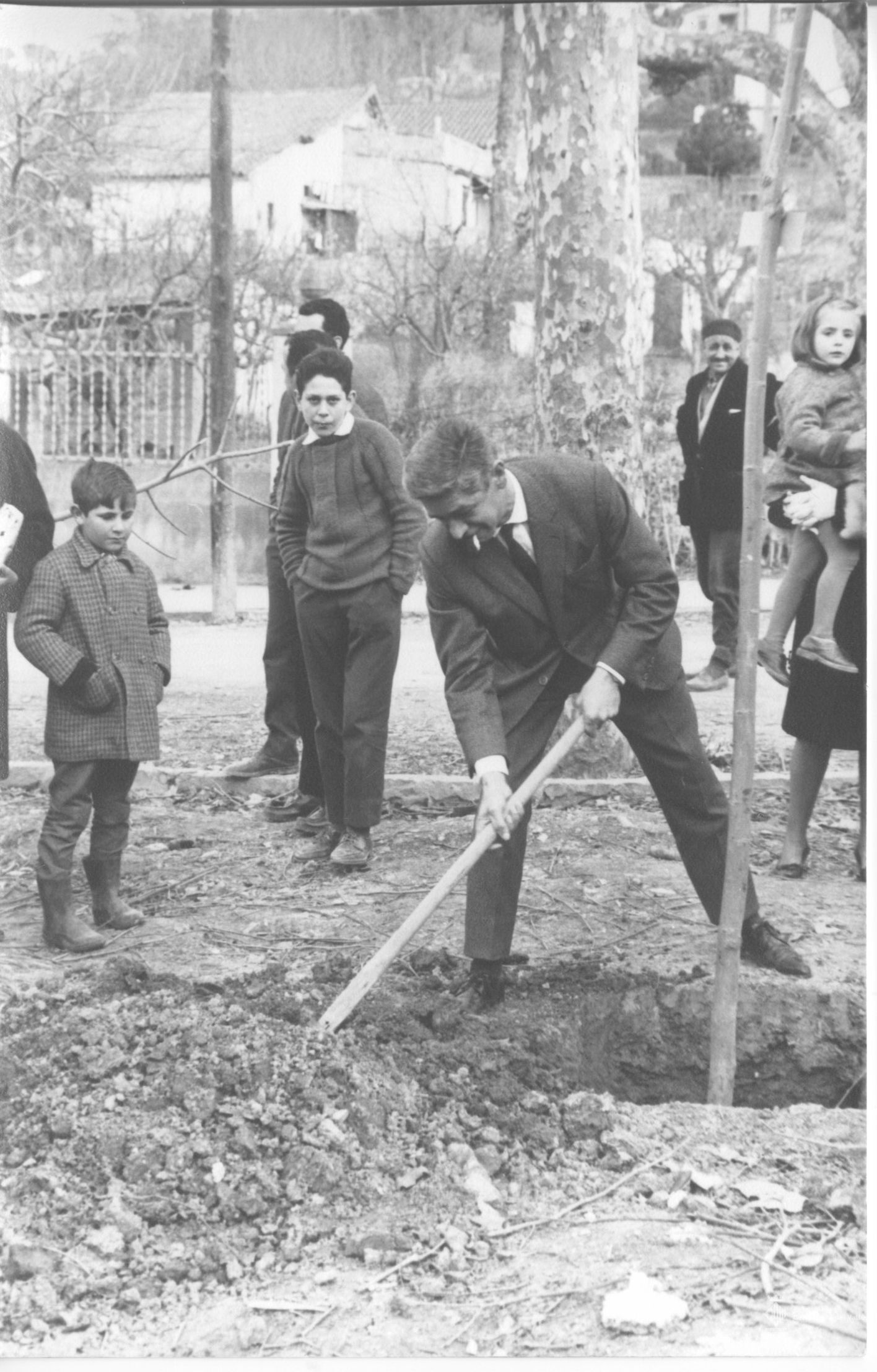 Escolars planten arbres a Cerdanyola del Vallès amb la presència de l'alcalde Domingo Fatjó Sanmiquel la dècada de 1960