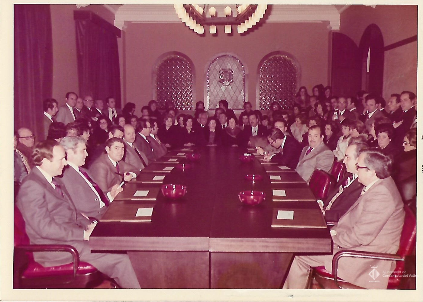 Acte d'homenatge a la sala del Ple de l'Ajuntament de Cerdanyola del Vallès presidit per l'alcalde Domingo Fatjó Sanmiquel per la jubilació del secretari Justiniano Hidalgo Barriuso el 26 de març de 1975